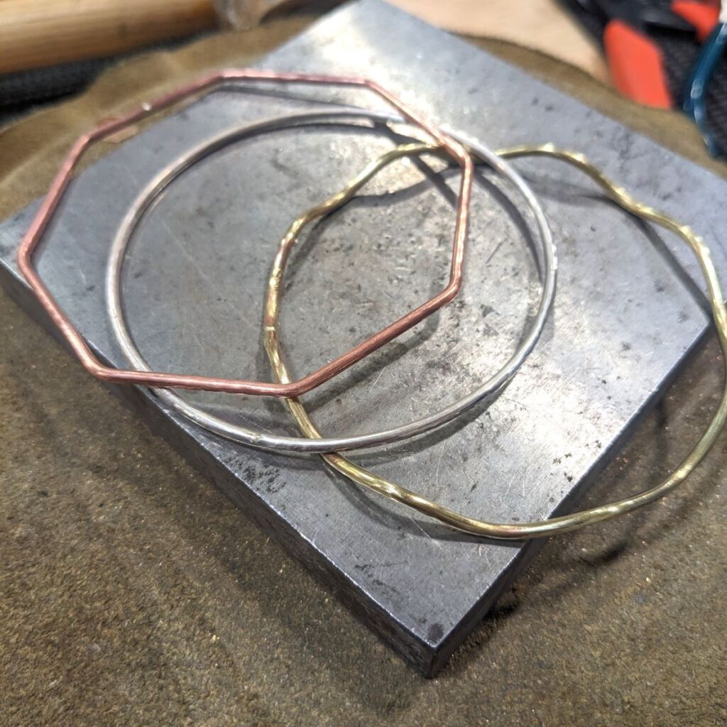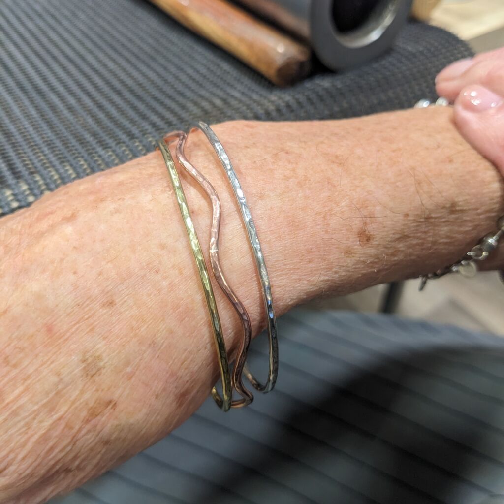 A range of texturing hammers and different shaped formers are available for you to use, so you can unleash your creativity to make your stack completely unique! Scroll through the photos to see some of the fabulous bangle sets made in previous workshops.