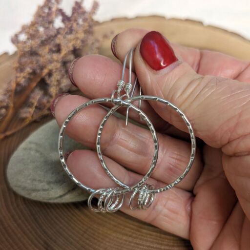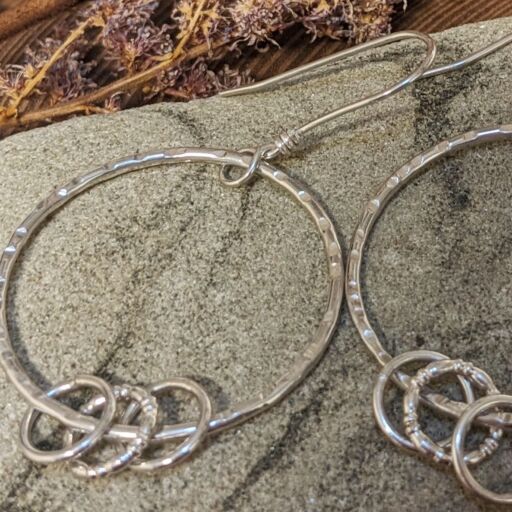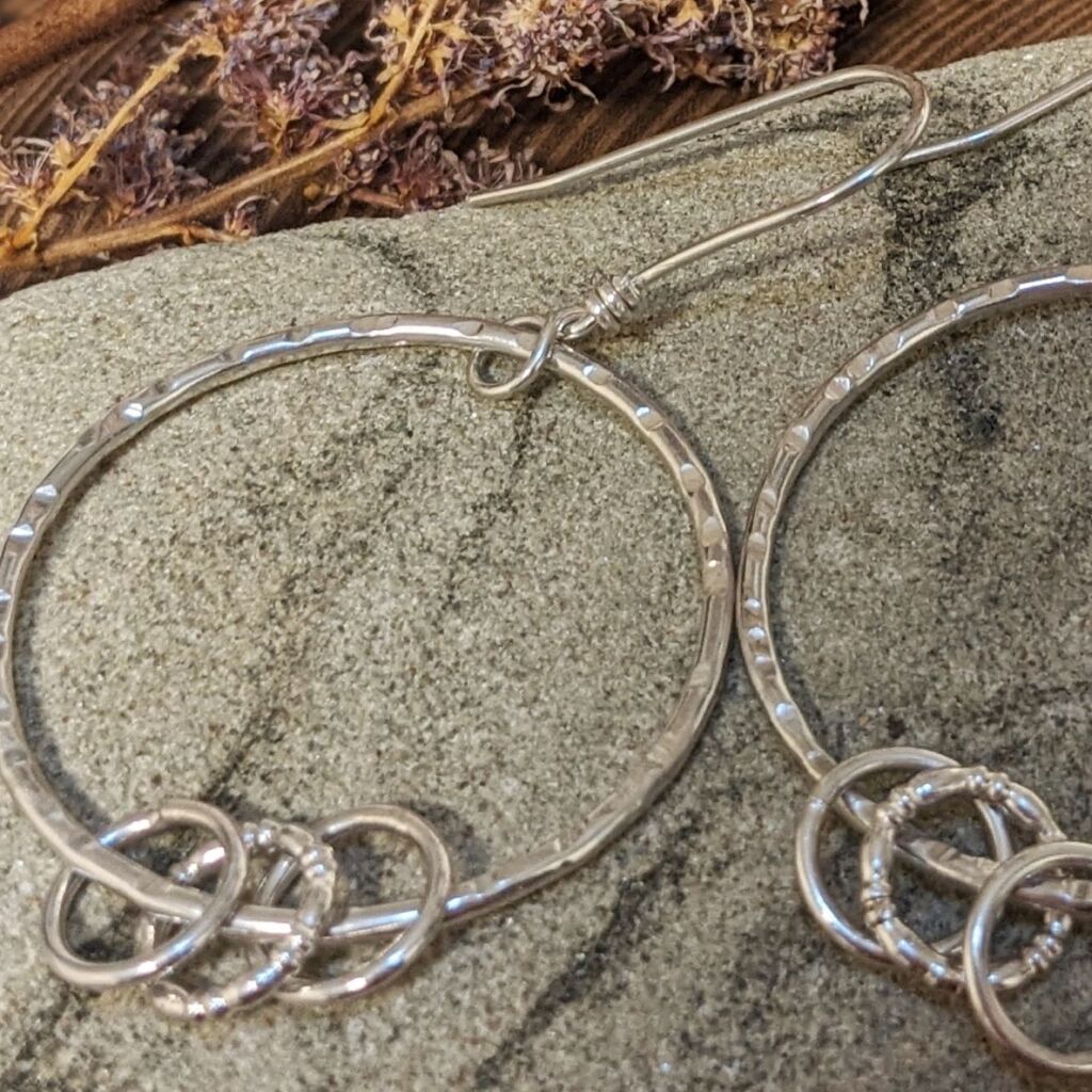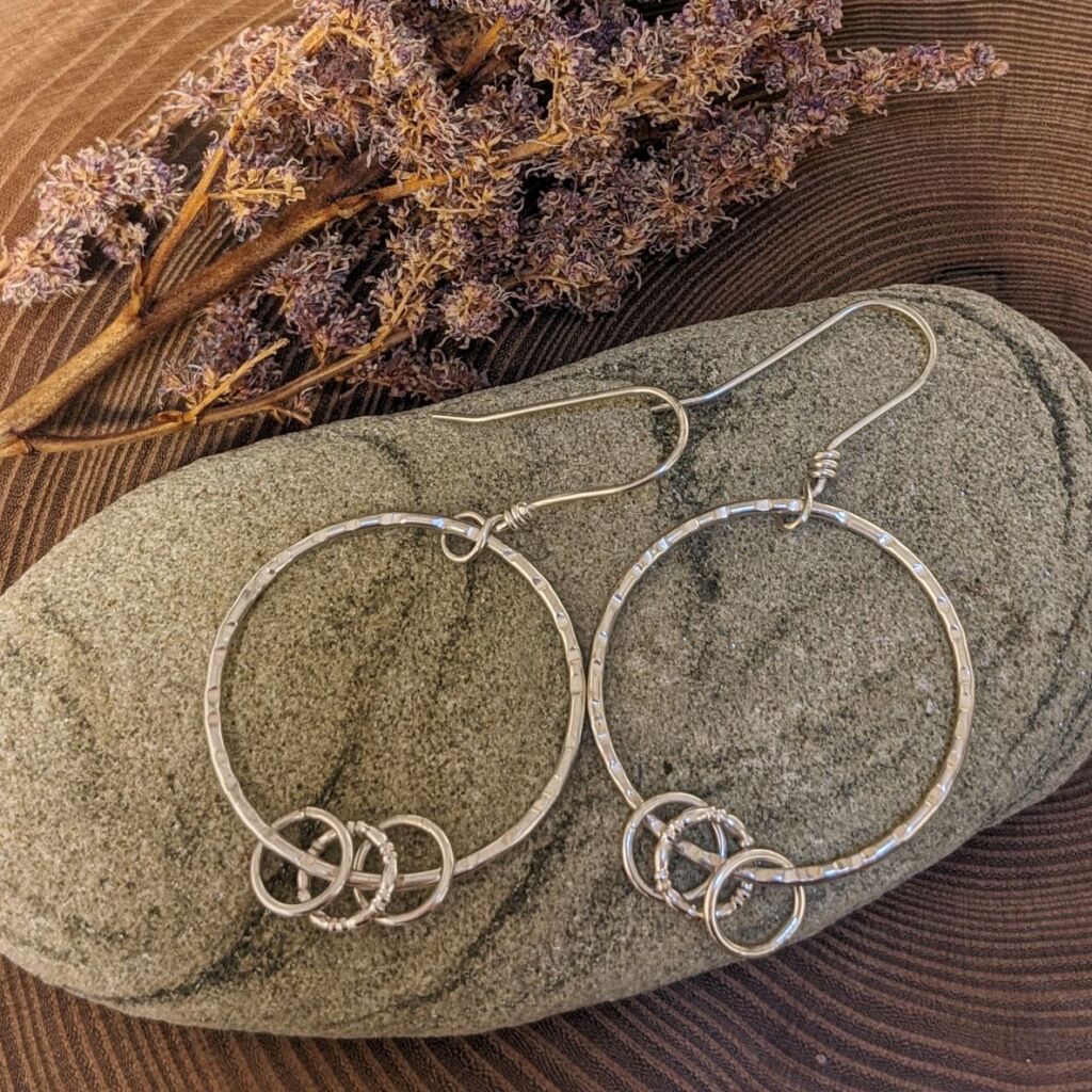Boho style dangly earrings with textured circle hoop and accent rings, all handcrafted in sterling silver. Hanging from sterling silver ear wires. Design sample, only one pair available.