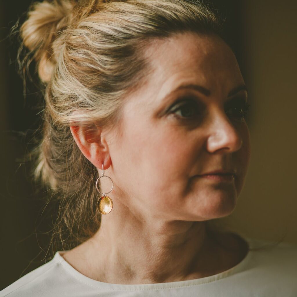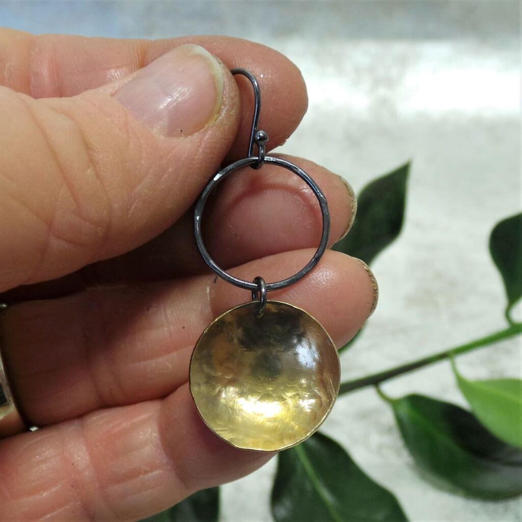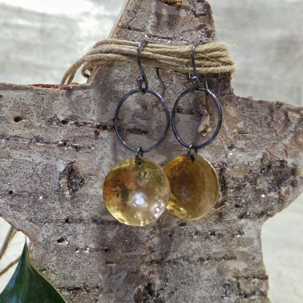 Brass and oxidised sterling silver drop earrings. End-of-line design, very limited stock.