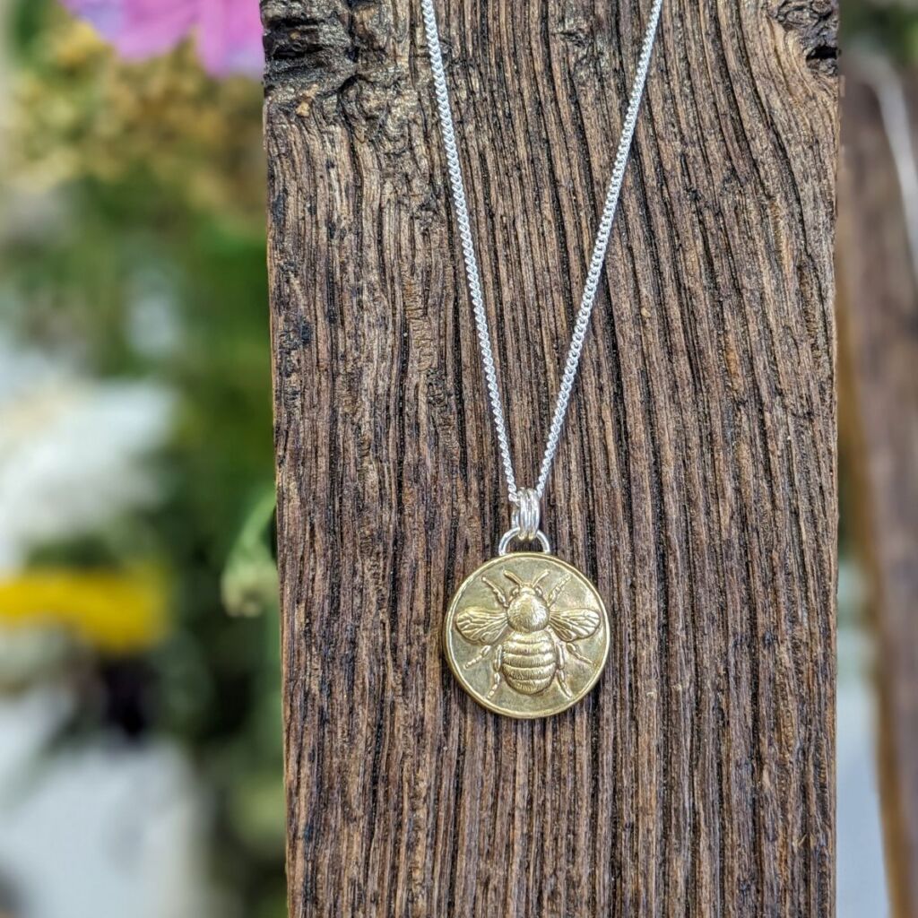 Each bee impression is produced individually me in my studio; there’s no mass production going on here! Firstly I melt down an ingot of brass using the offcuts I keep from other projects. Then I press the shape using an impression die and a hydraulic press. For the larger pieces this could be repeated 4 or 5 times before I’m totally happy with the depth and detail of the print, annealing the metal between each stage. Once I think I’ve got the perfect print, I file away the excess material and smooth the edges then solder a sterling silver ear post to the back. The impression gets a light oxidising to really make the details pop before the whole thing gets a final polish. And voila!