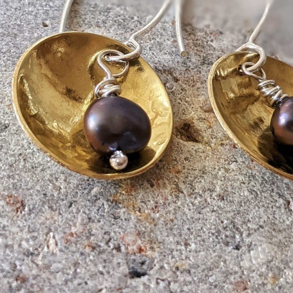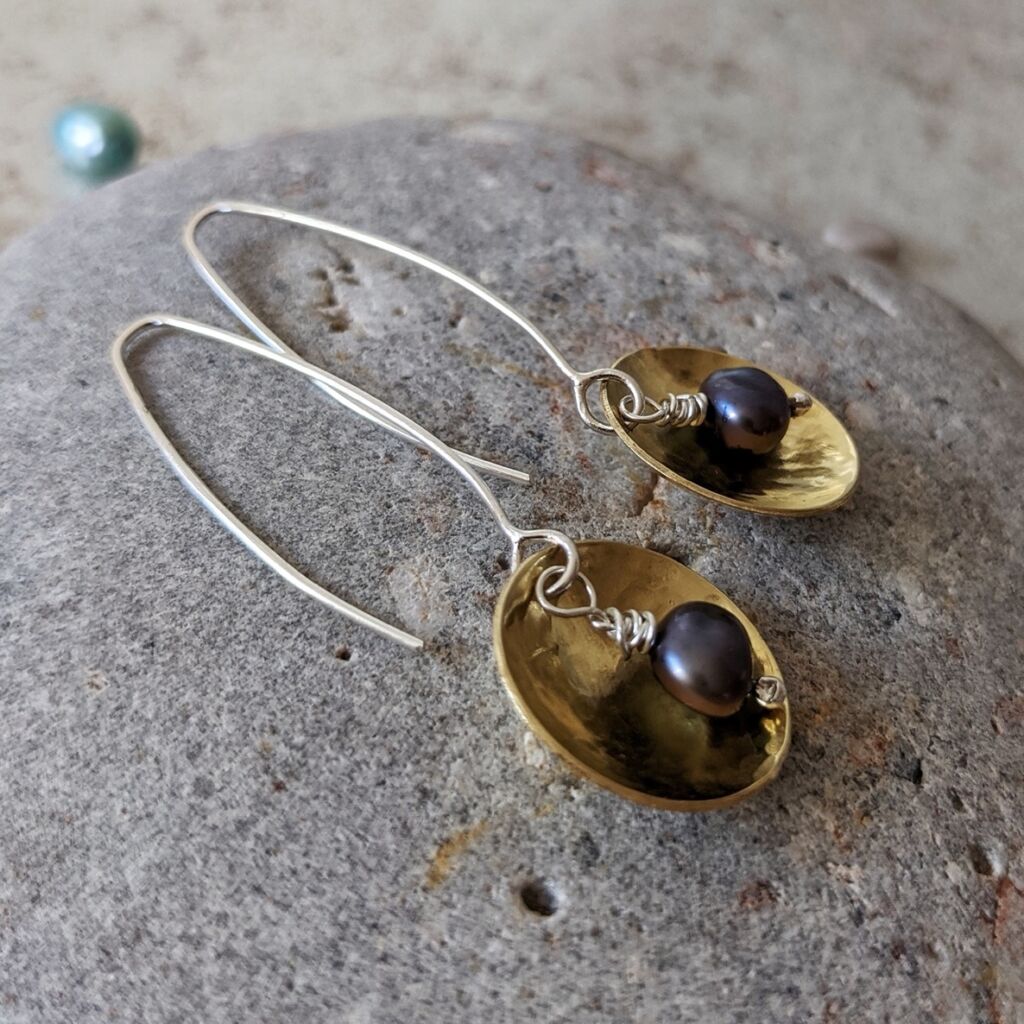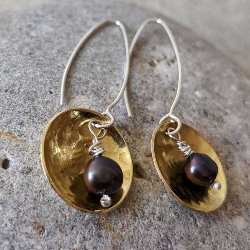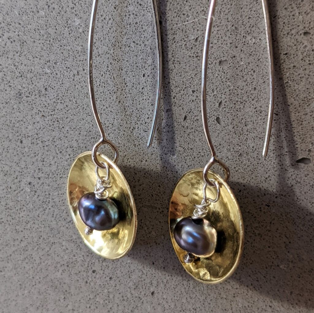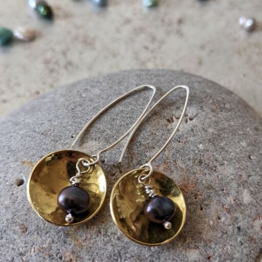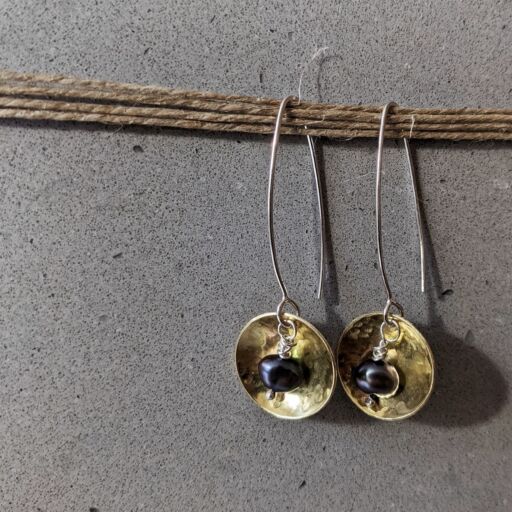 These brass and pearl long drop earrings have been made from hammered and slightly domed brass discs and freshwater cultured pearls. They hang from elongated sterling silver elliptical ear wires. You can customise your earrings with your choice of pearl colour! The hammered and polished surface of the brass gives a faceted effect and really makes the earrings sparkle. They will dress up any outfit, whilst still being lightweight and delicate enough for everyday wear. These earrings would make particularly beautiful bridal jewellery.