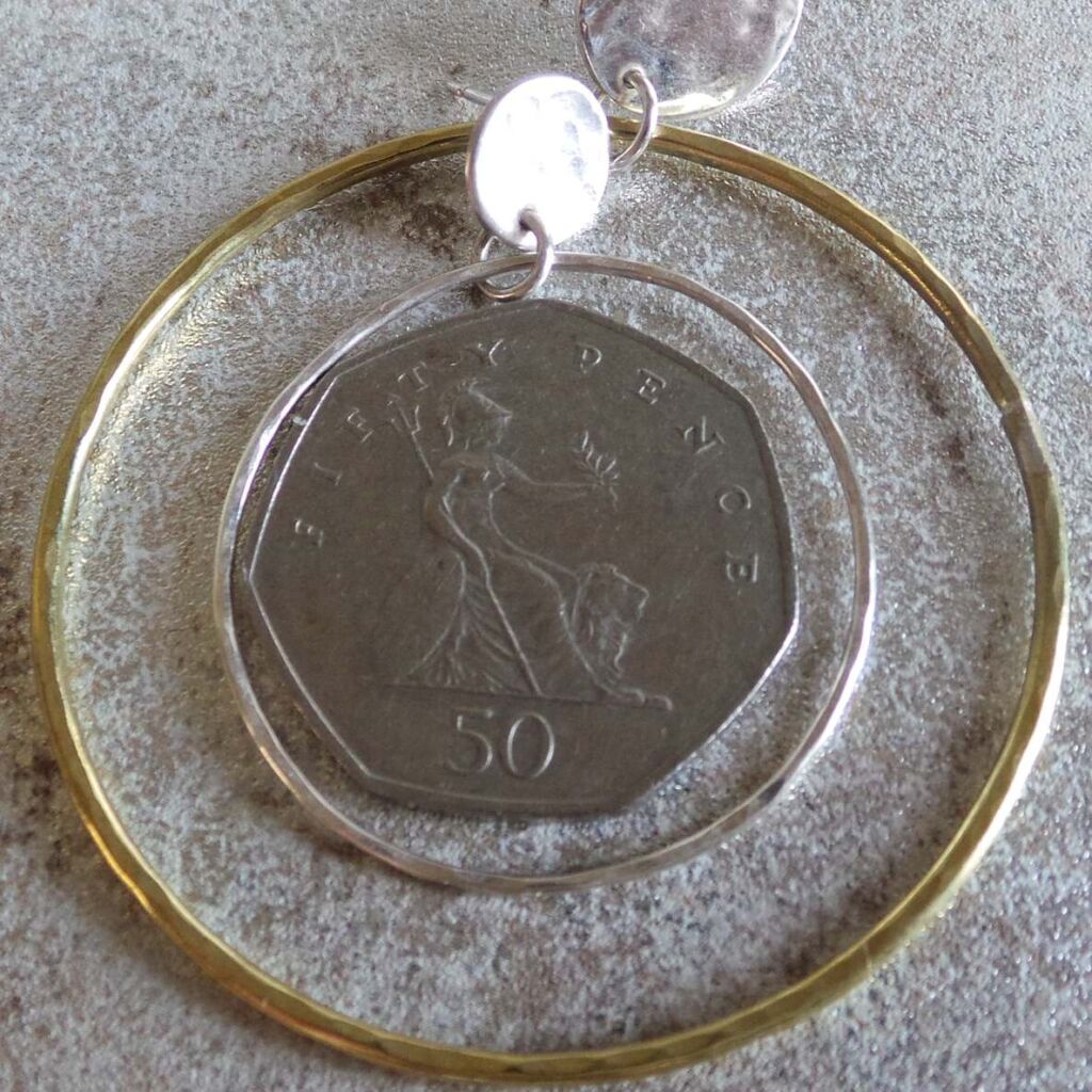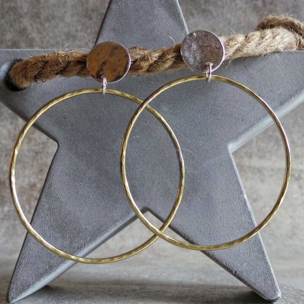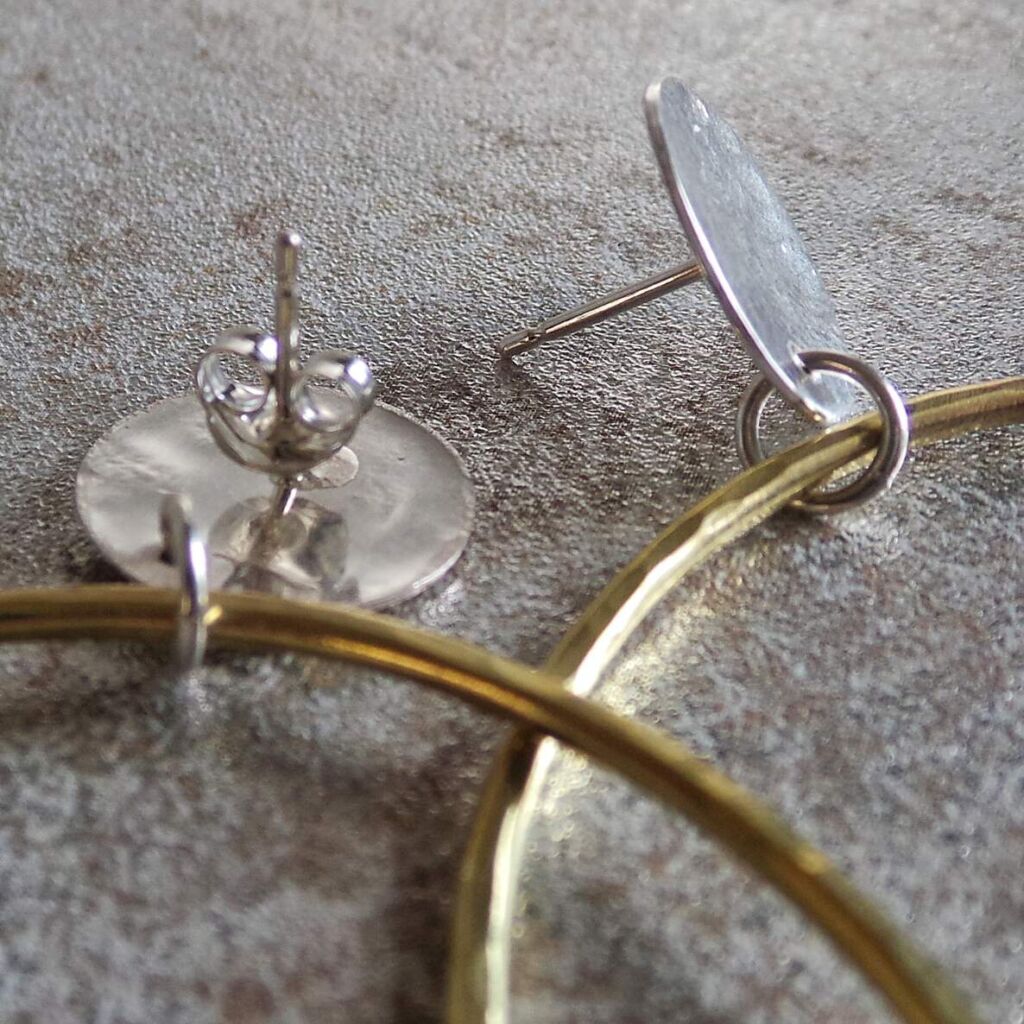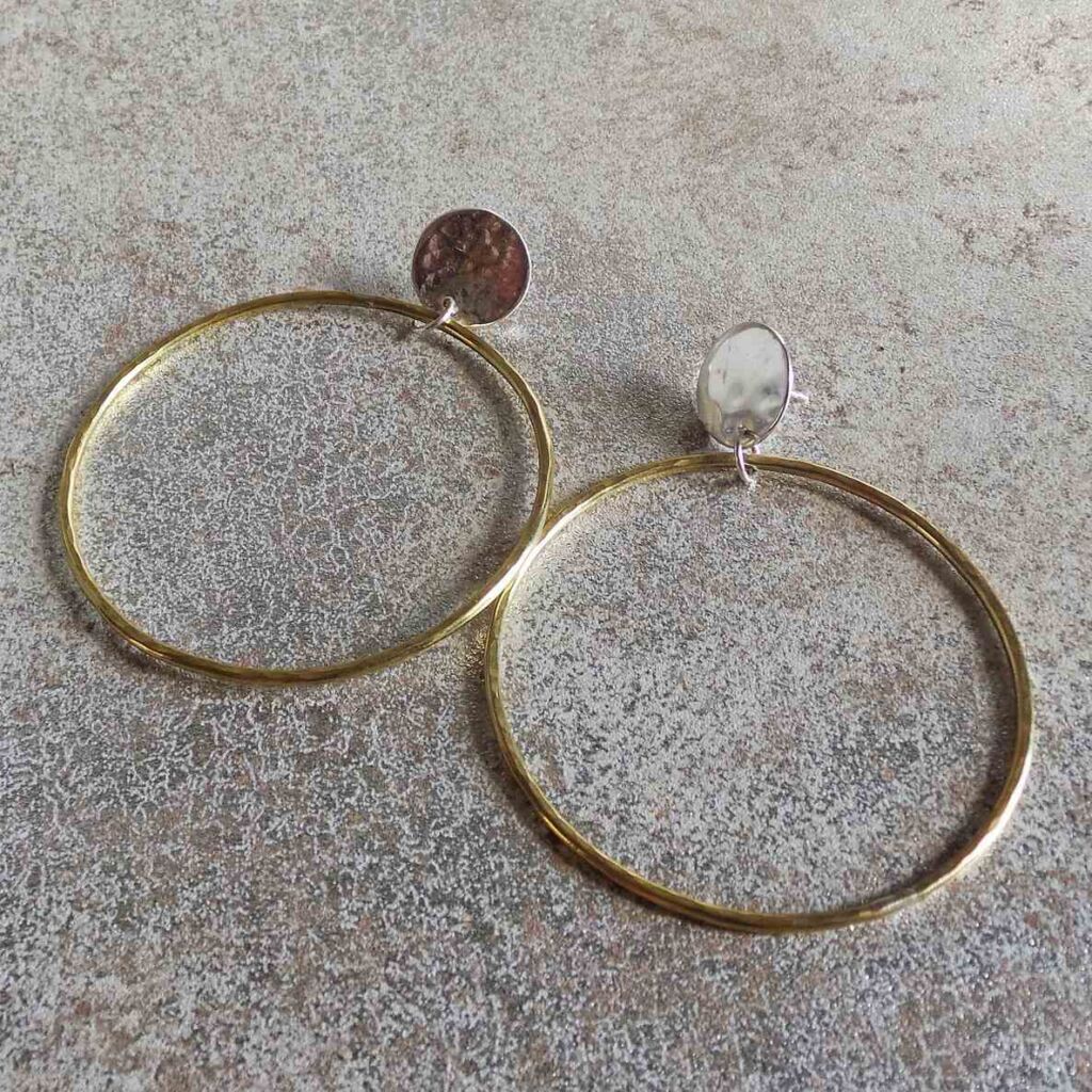These striking earrings feature a circular brass hoop hanging from a sterling silver stud earring. Both the wire hoop and the stud have been gently hammered for texture and some added sparkle. Despite their fabulous eye-catching dangly movement, the earrings are still lightweight and easy to wear thanks to the secure stud fastening.