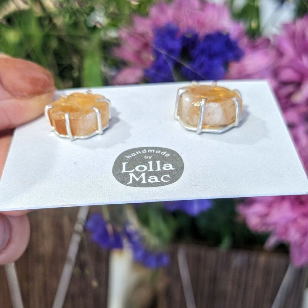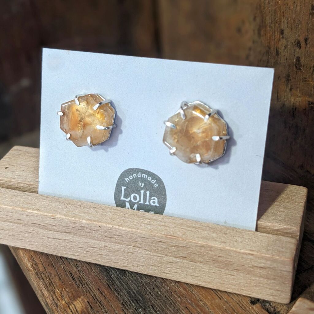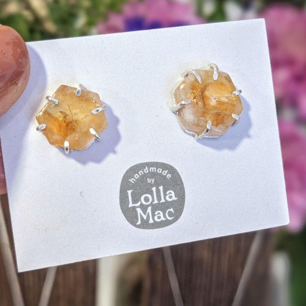 These gorgeous honey-coloured studs feature rough cut hexagon slices of beautiful citrine. Each slice has been claw set in sterling silver, keeping as much of the natural beauty of the stone exposed as possible. Only two pairs of these special earrings are available, and for part of my Summer 2025 ‘HoneyBee’ collection. Each pair is completely unique; this listing is for the pair shown in the photos.