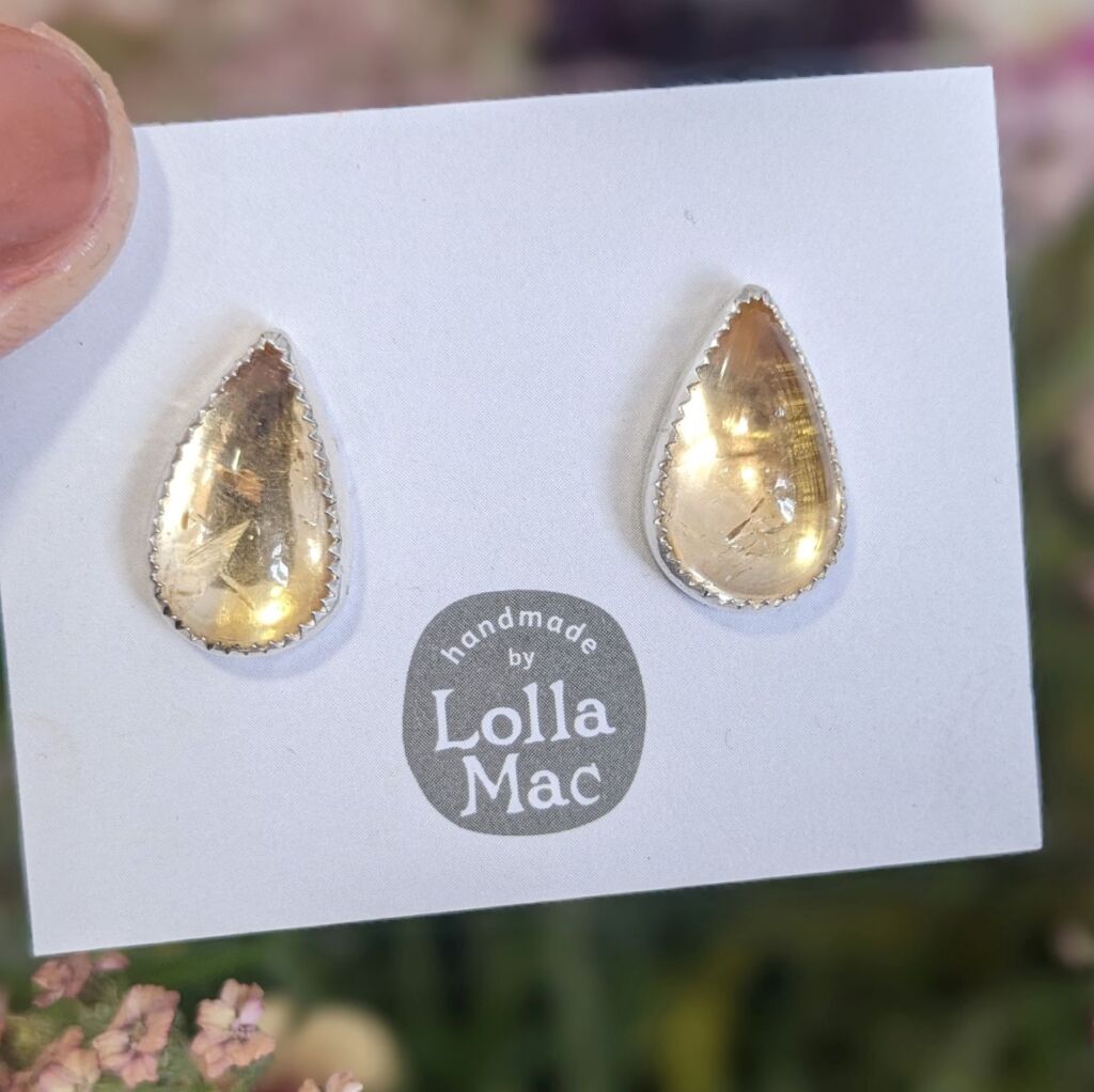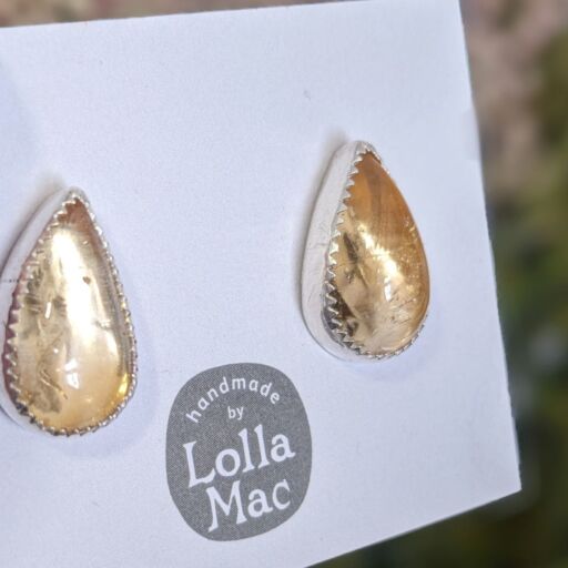 These lovely honey-coloured studs feature gorgeous teardrop shaped Citrine cabochons set in sterling silver, and form part of my Summer 2025 ‘HoneyBee’ collection. The beautiful pale golden colour of the malachite are completely natural. The silver settings have a serrated edge detail for a pretty finishing touch.