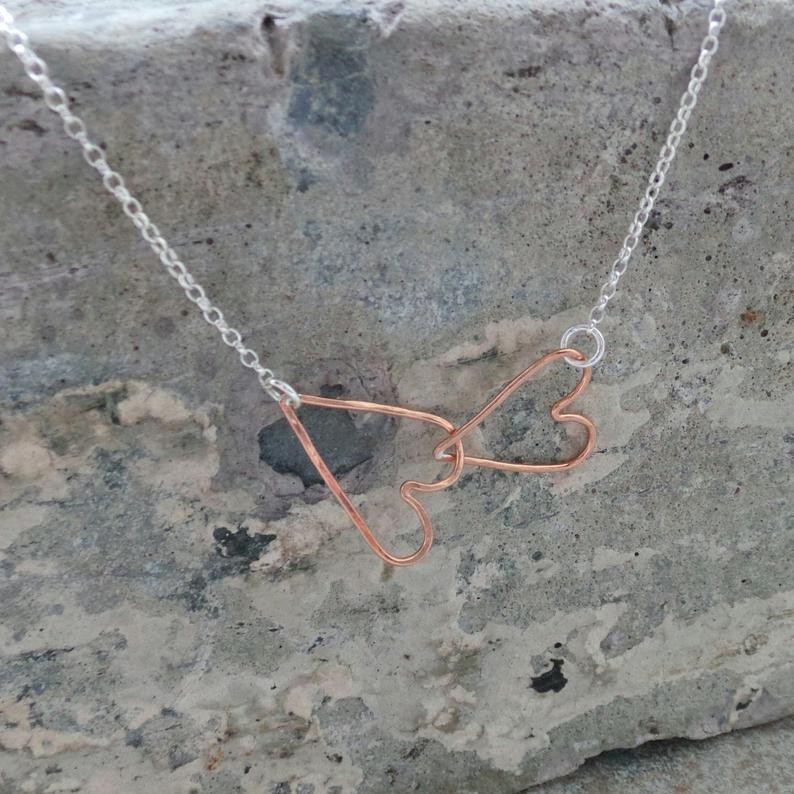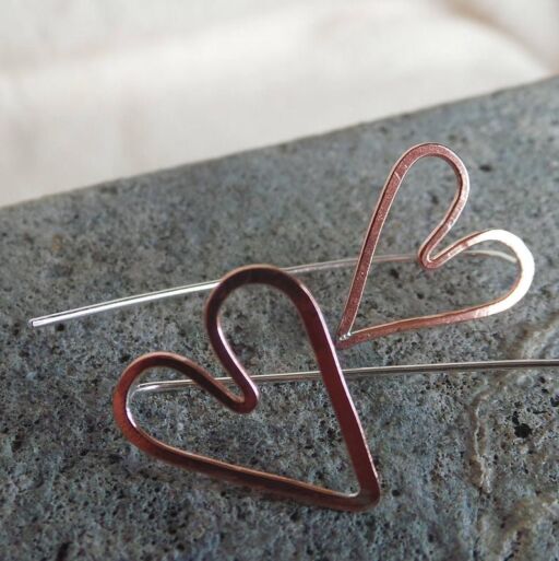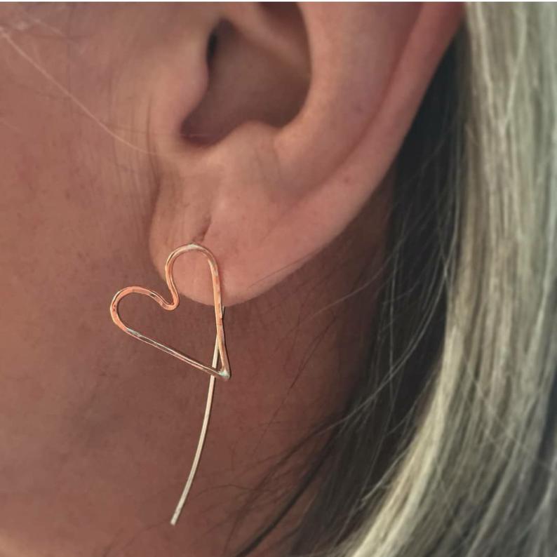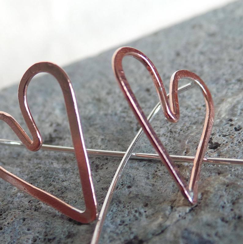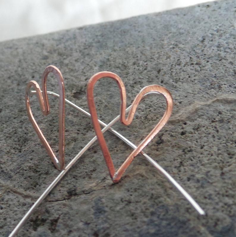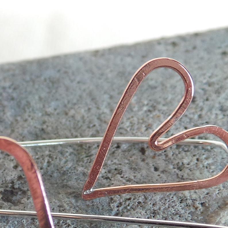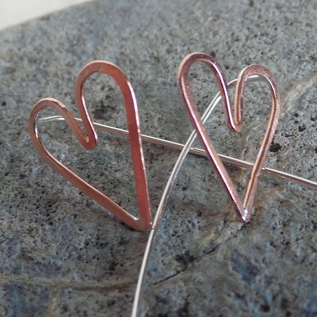 These pretty, delicate heart shaped ear threaders have been hand formed from copper and sterling silver wire and gently hammered for texture. They are designed so that the copper heart sits flat to the ear, with the long silver wire ‘tail’ hanging down from the back.