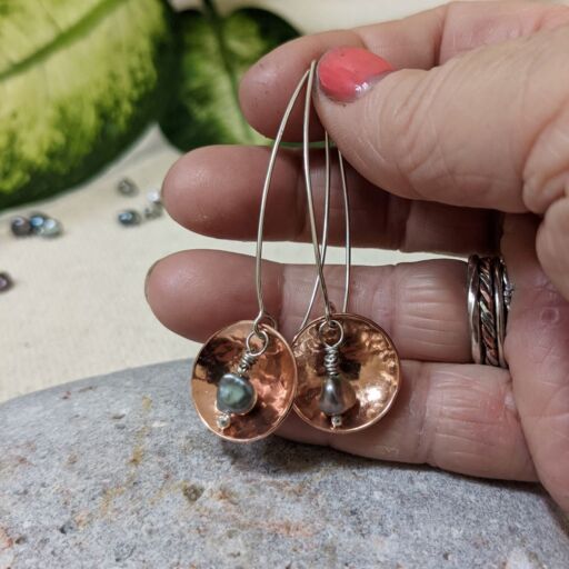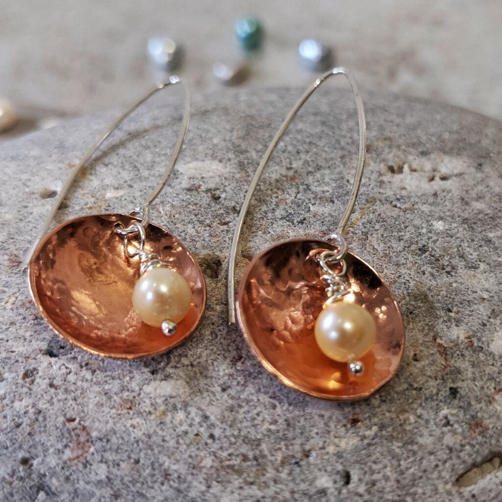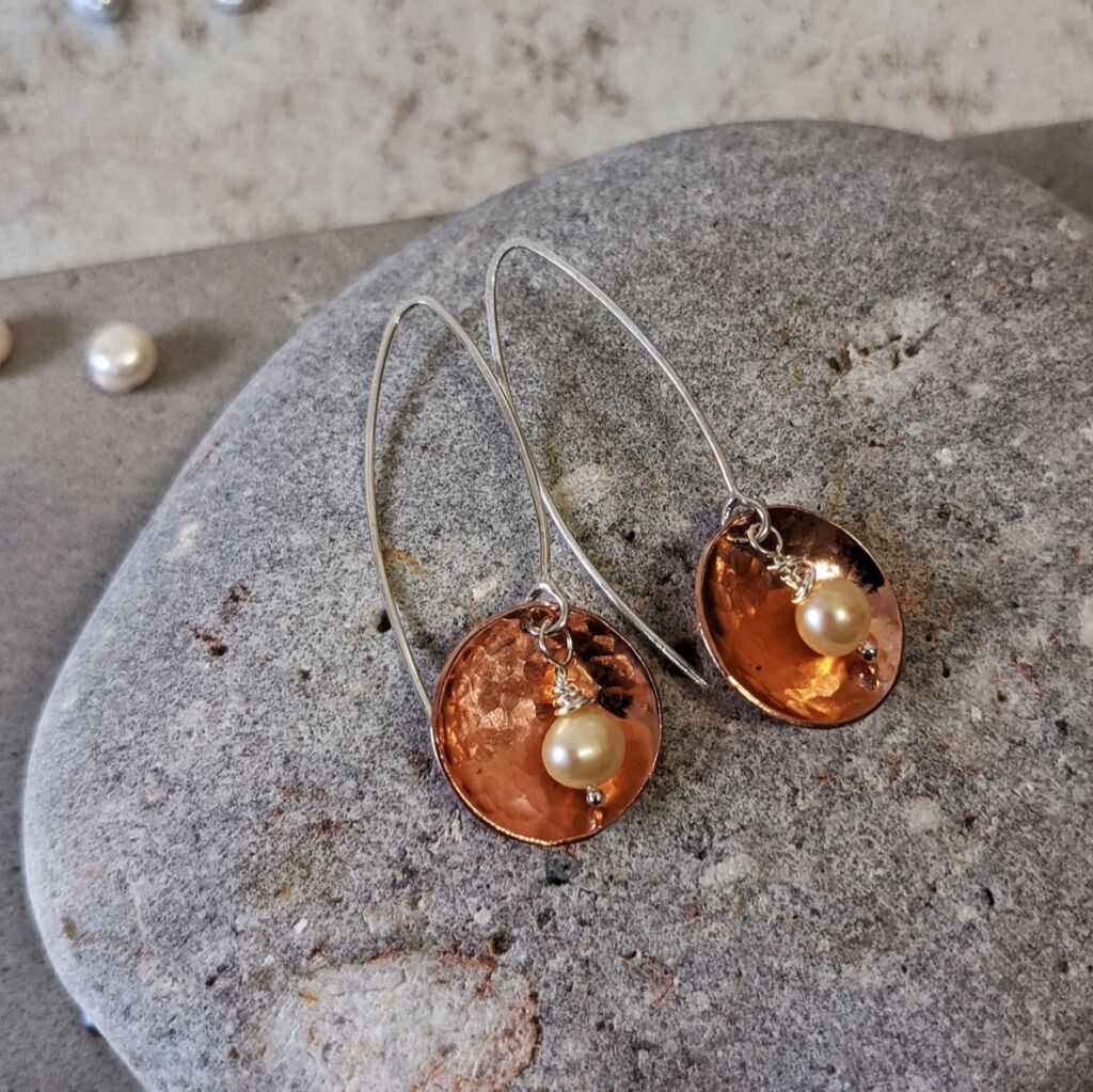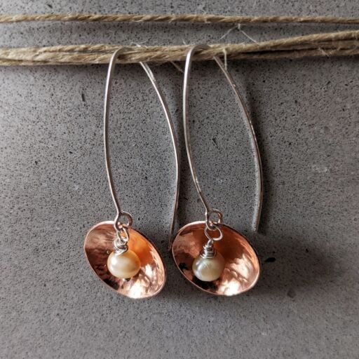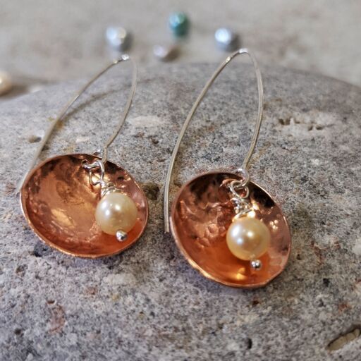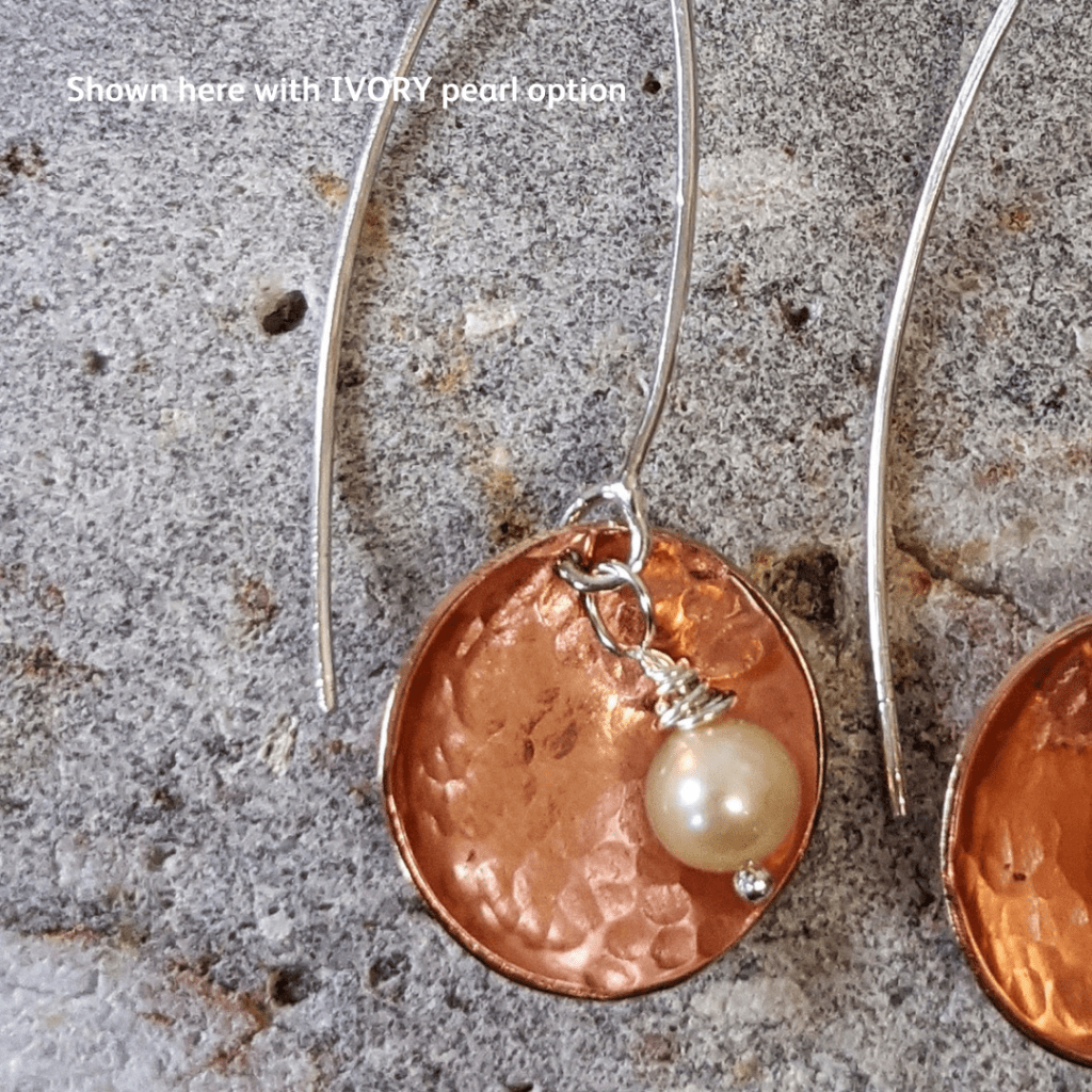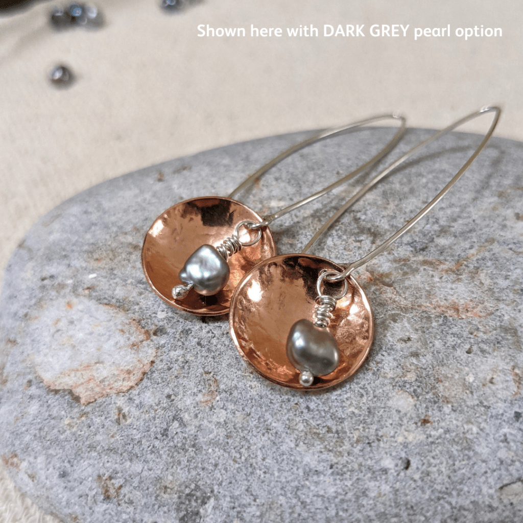 These copper and pearl long drop earrings have been made from hammered and slightly domed copper discs and freshwater cultured pearls. They hang from elongated sterling silver elliptical ear wires. You can customise your earrings with your choice of pearl colour! The hammered and polished surface of the copper gives a faceted effect and really makes the earrings sparkle. They will dress up any outfit, whilst still being lightweight and delicate enough for everyday wear. These earrings would make particularly beautiful bridal jewellery.