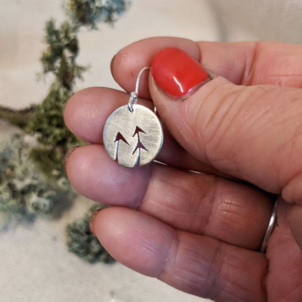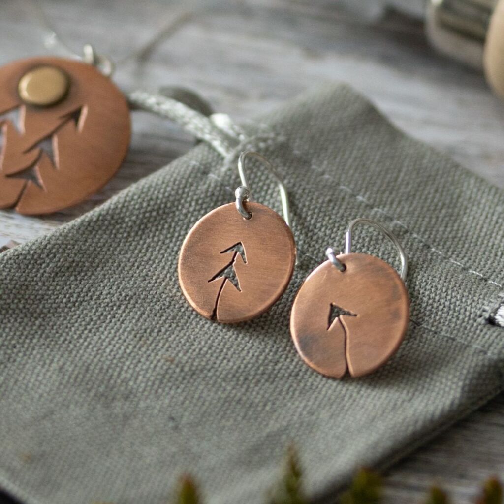 These pretty copper pine tree earrings were inspired by the landscape and dark skies of Kielder Forest in Northumberland. The pine tree shape is created by piercing through copper, creating a cut-out design.  Each tree is drawn individually and cut out entirely by hand using a jewellers’ piercing saw, meaning every earring is completely unique; just like the trees which inspired them! The earrings have been lightly oxidised with a brushed finish, and hang from sterling silver ear wires.