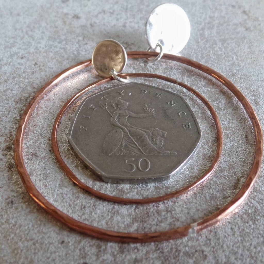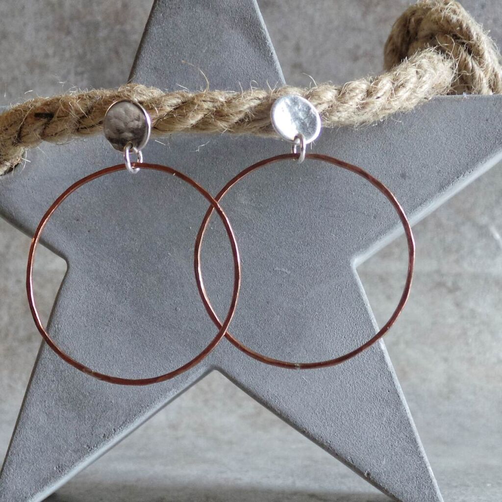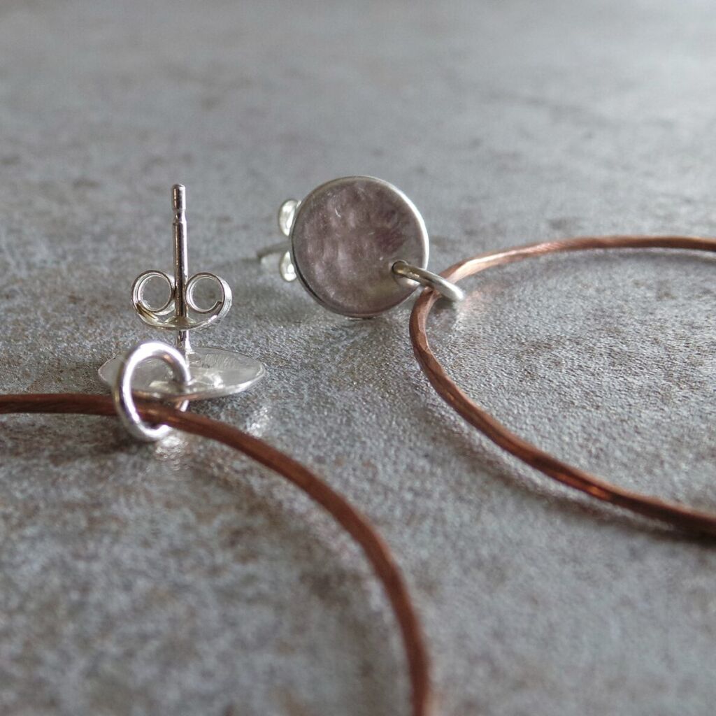 These eye-catching earrings feature a delicate circular copper hoop hanging from a sterling silver stud earring. Both the wire hoop and the disc of the stud have been gently hammered for texture and some added sparkle. The earrings are ultra lightweight yet still have a lovely dangly movement, and thanks to the stud fastening feel very secure in the ears.