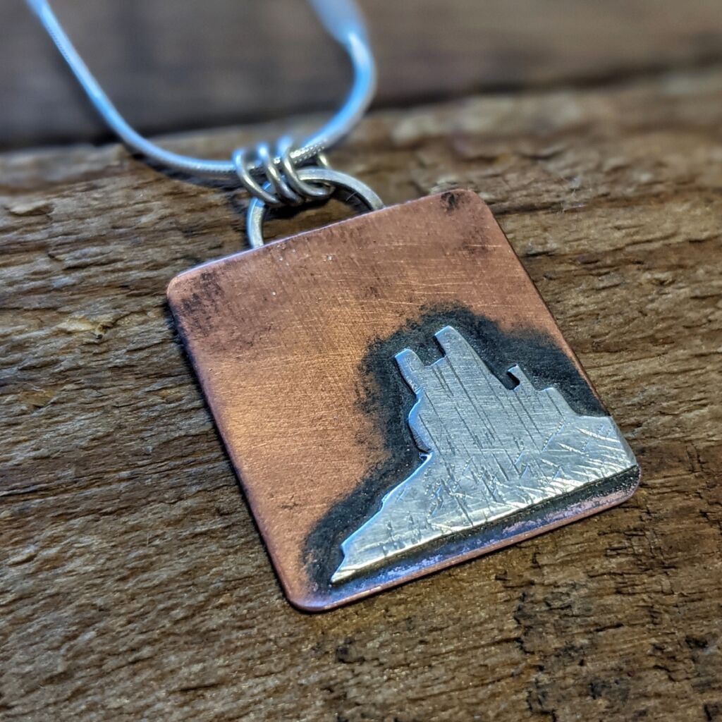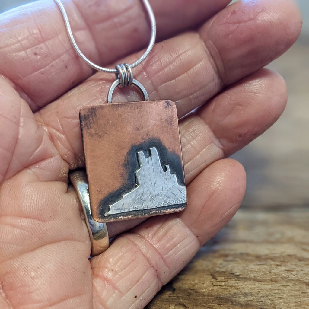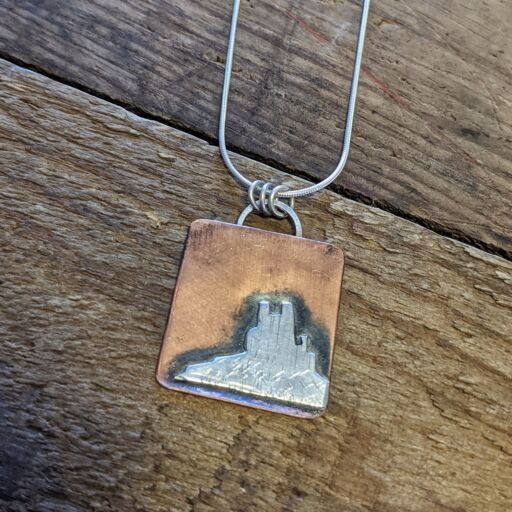 Copper and sterling silver castle pendant. Inspired by the Northumbrian coastal castles of Bamburgh and Lindisfarne. Sample piece, only one available.