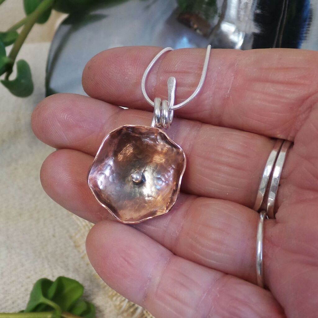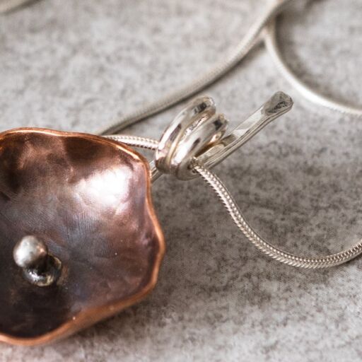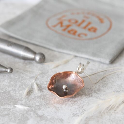 Inspired by beautiful garden blooms, this striking copper & silver flower pendant has been entirely handcrafted from sheet metal and wire. The single bloom has been hand formed from copper sheet, and its centre lightly oxidised to create depth and enhance the texture. It is attached to a twisted sterling silver stem, reminiscent of climbing vines, and hangs from a fluid snake chain.