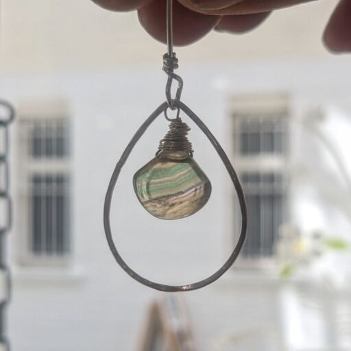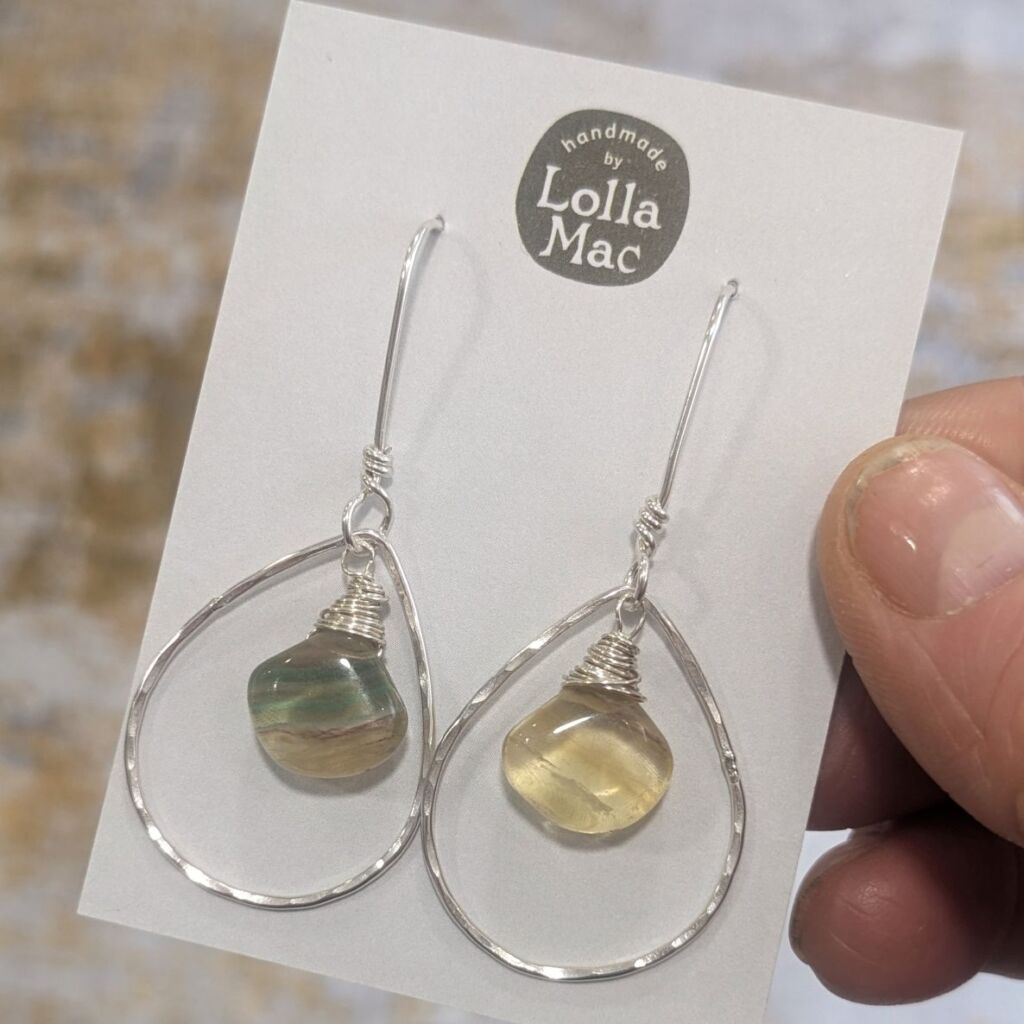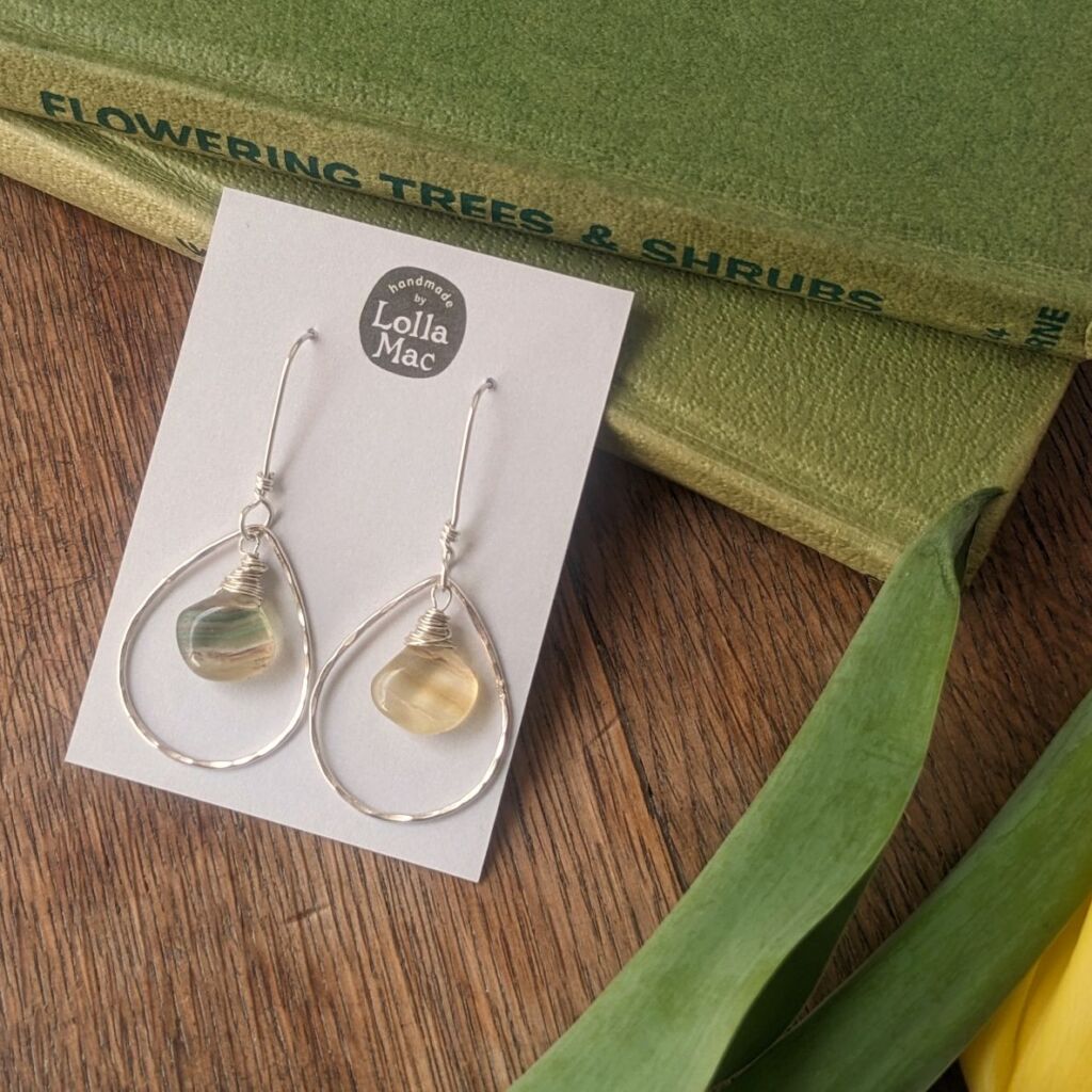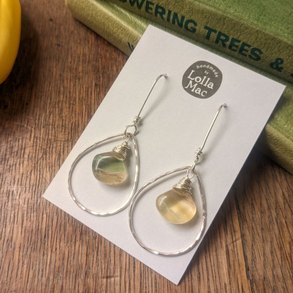 These pretty drop feature briolette cut fluorite gemstones, hanging within teardrop shaped hoops of sterling silver. The silver hoops have been lightly hammered for a sparkly, textured finish. The colours of the fluorite are completely natural and varied, each one chosen to evoke feelings of a springtime landscape filled with yellow daffodils. The earrings hang from hand formed sterling silver ear wires.