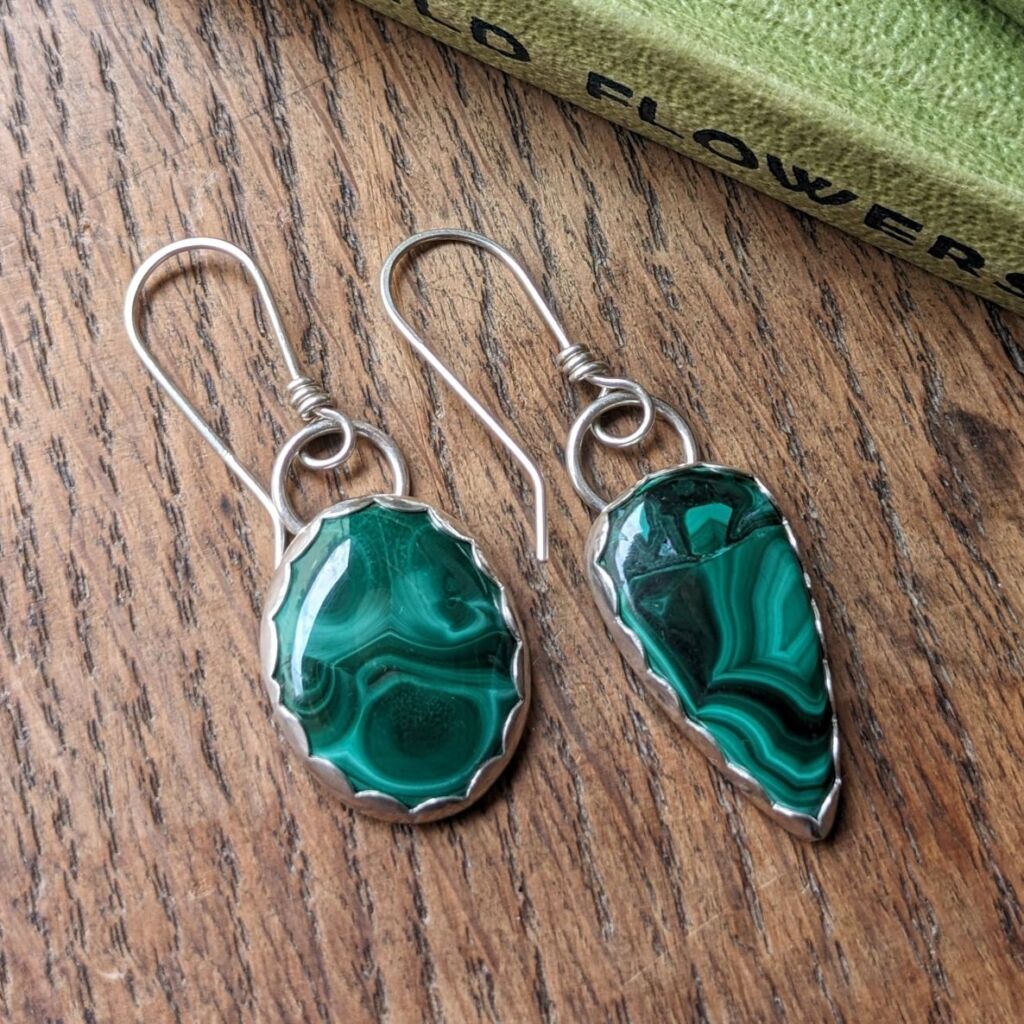 I absolutely adore the variations in the shades of green contained even within just one stone, as well as the beautiful patterns revealed when the stones are cut and polished. Over the past few years I’ve slowly built up a collection of cabochons, just waiting to be turned into beautiful jewellery. The inspiration for the Spring Greens collection came (as it often does!) from being out walking. I noticed the colour of the landscape slowly changing, with green shoots of spring slowly coming to life, and that stash of malachite stones came straight to mind!