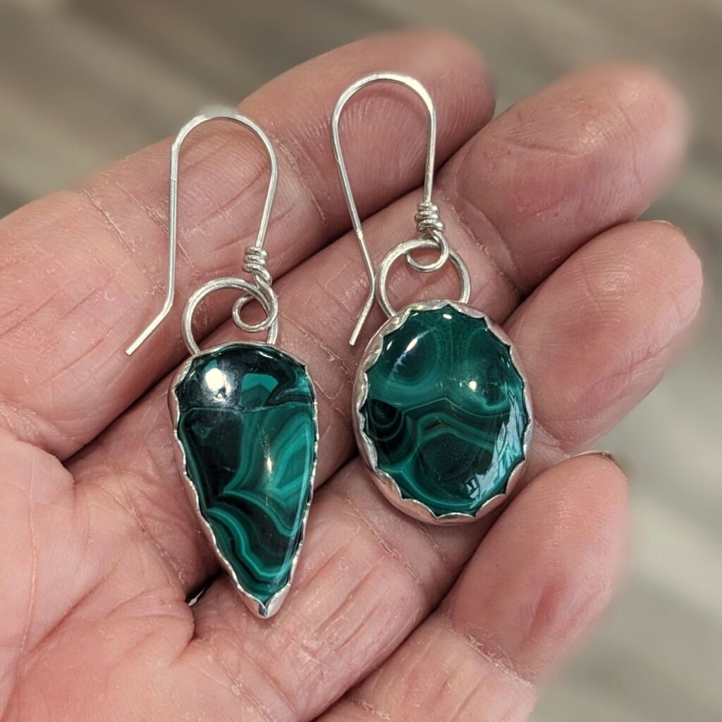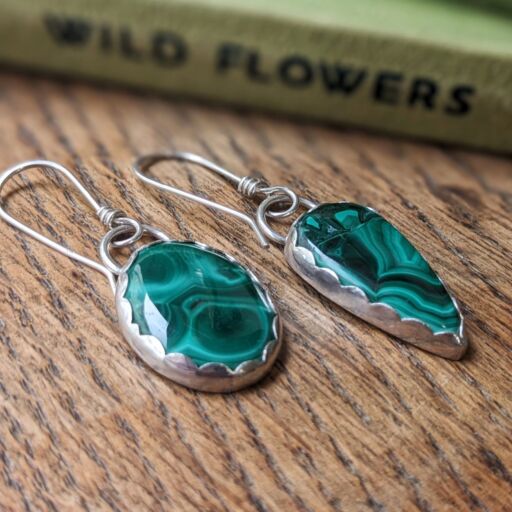 These fabulous asymmetric dangly earrings feature a mis-matched pair of gorgeous green Malachite cabochons set in sterling silver, and form part of my Spring 2025 ‘Spring Greens’ special collection. The beautiful fresh green colours and patterns of the malachite are completely natural. The silver settings have a scalloped edge detail and hang from sterling silver ear wires for the perfect dangle.