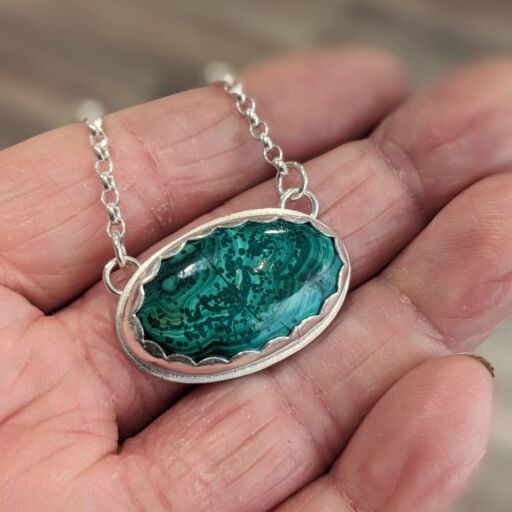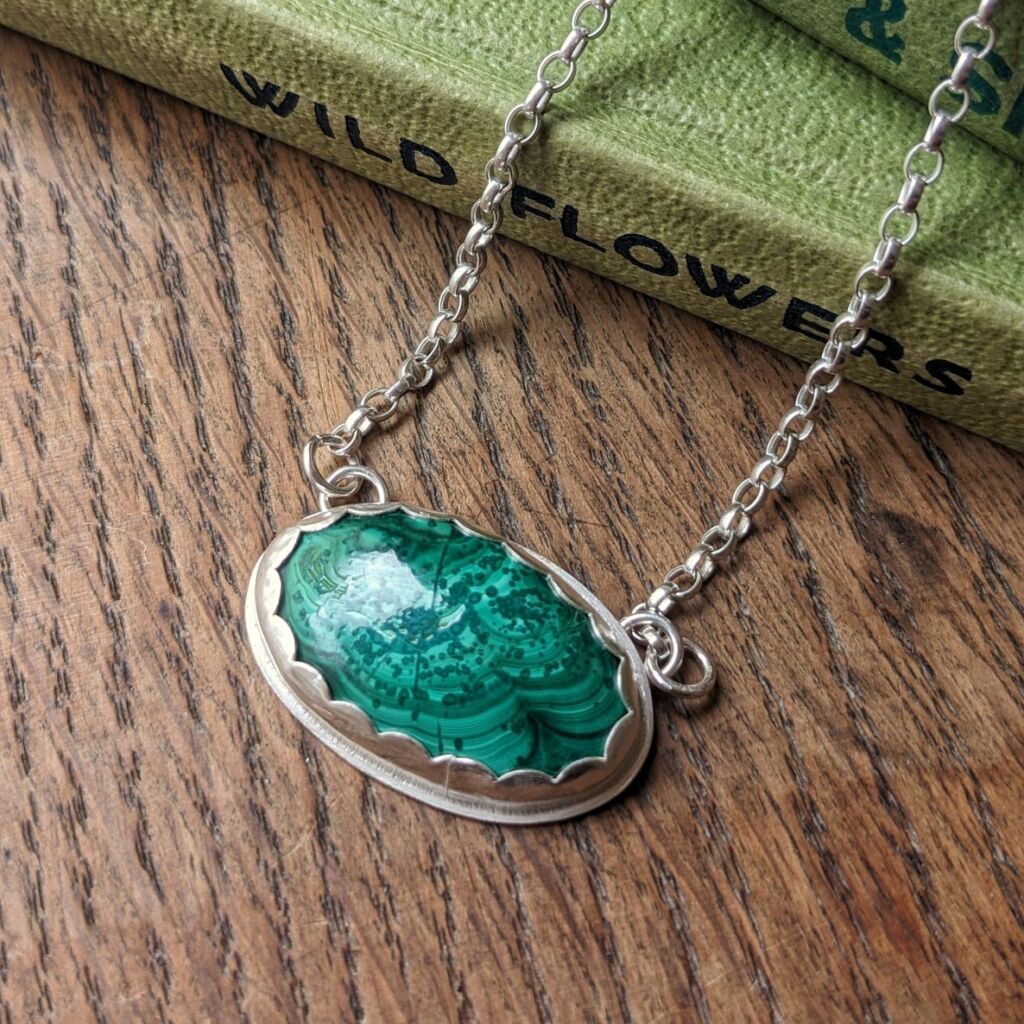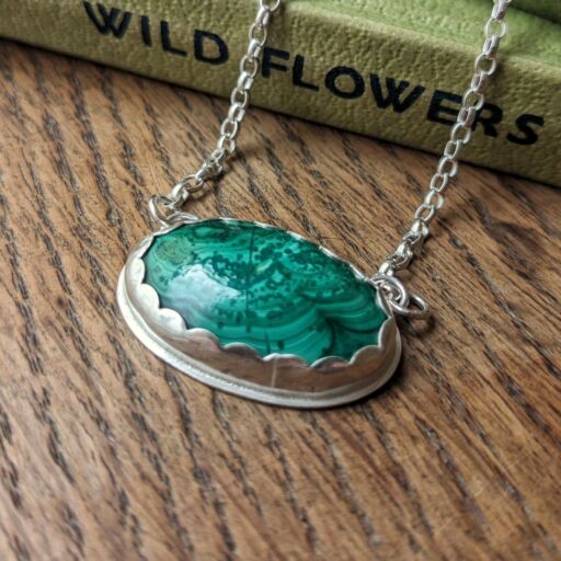 This lovely necklace features a central Malachite cabochon set in sterling silver, and forms part of my Spring 2025 ‘Spring Greens’ special collection. The beautiful fresh green colours and patterns of the malachite are completely natural. The setting has a pretty scalloped edge detail, and the necklace is completed with a belcher chain.