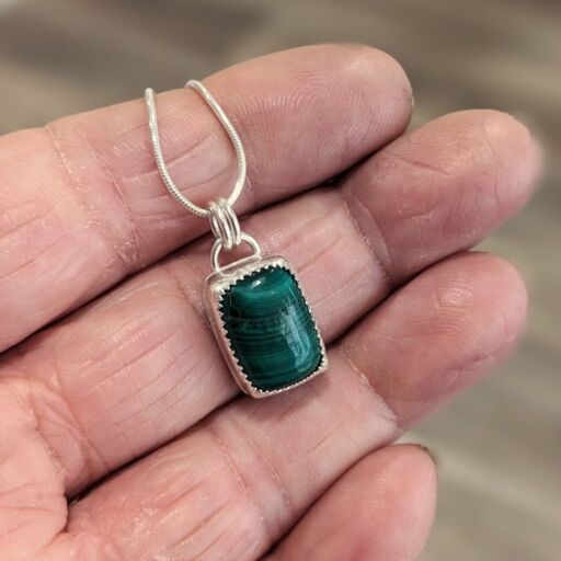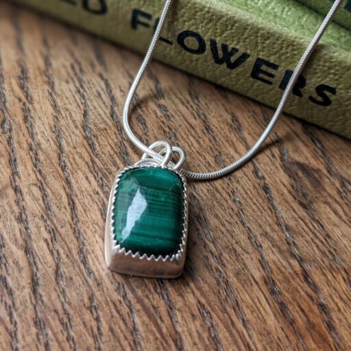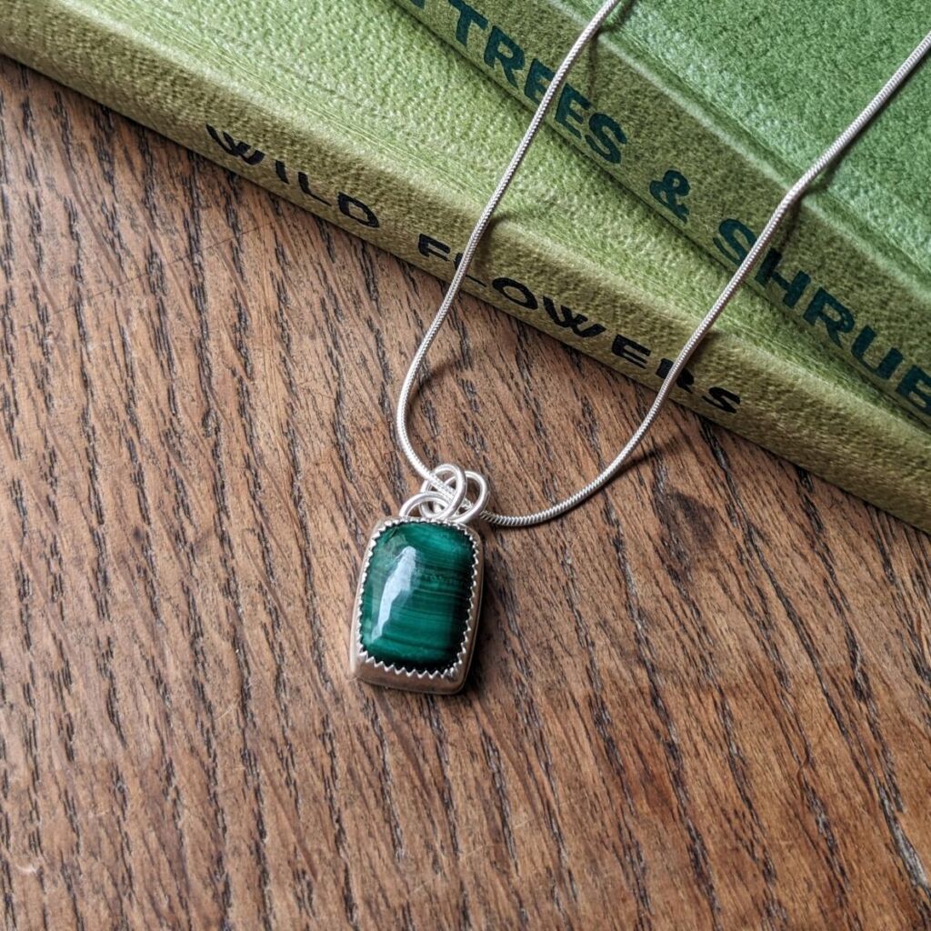 This sweet necklace features a rectangular malachite cabochon set in sterling silver, and forms part of my Spring 2025 ‘Spring Greens’ special collection. The beautiful fresh green colours and patterns of the malachite are completely natural. The silver setting has a serrated edge detail, and the pendant is completed with a sterling silver snake chain.