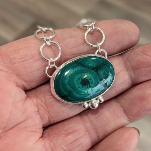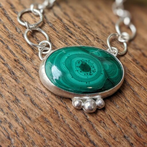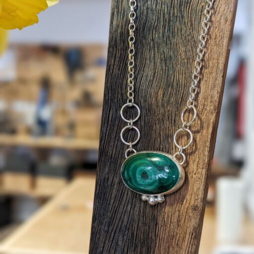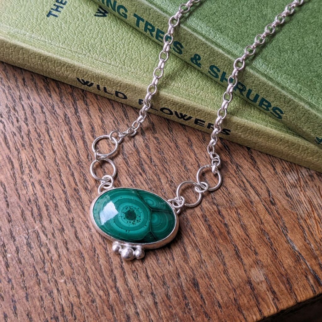 This beautiful necklace features a central Malachite cabochon set in sterling silver, and forms part of my Spring 2025 ‘Spring Greens’ special collection. The beautiful fresh green colours and patterns of the malachite are completely natural. The setting has been accented with silver balls, and the necklace completed with hand forged circular links and a belcher chain.