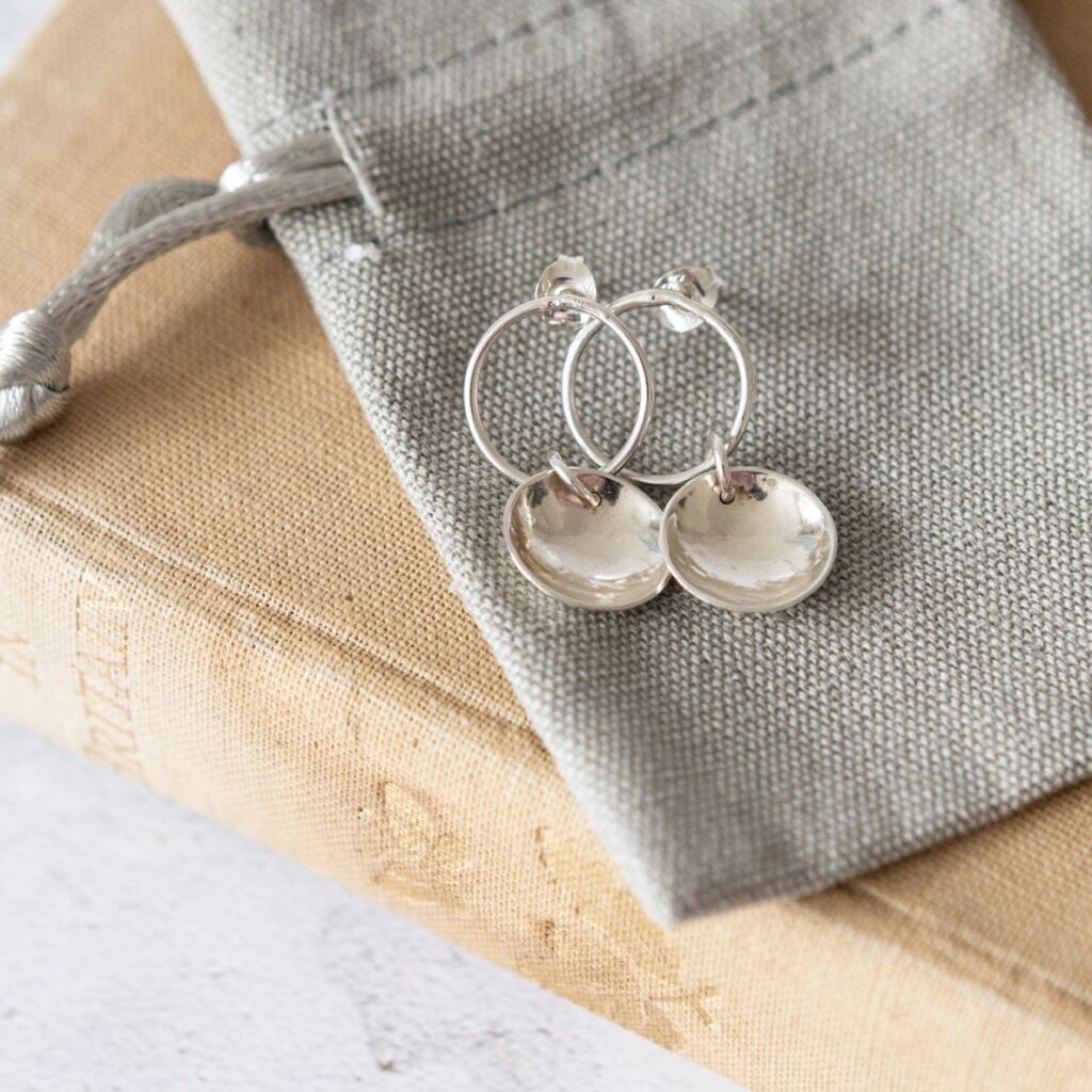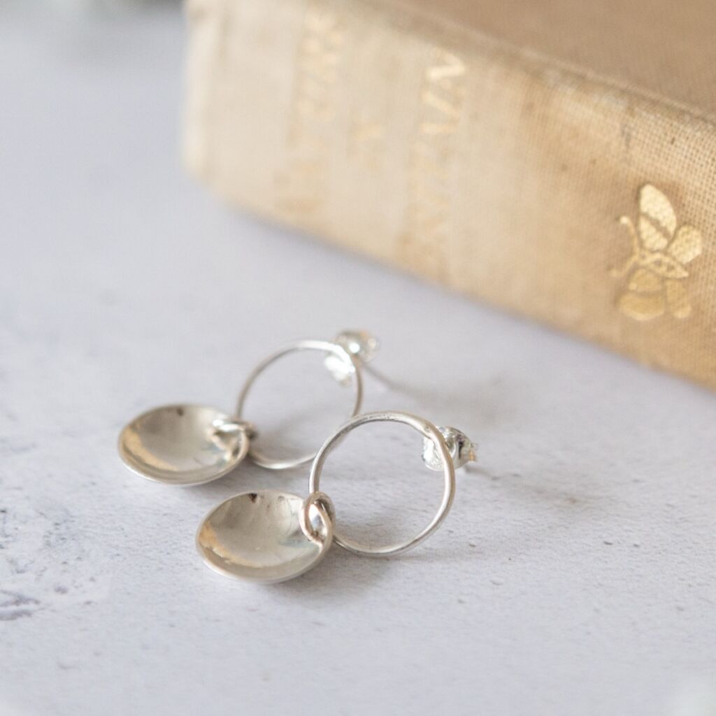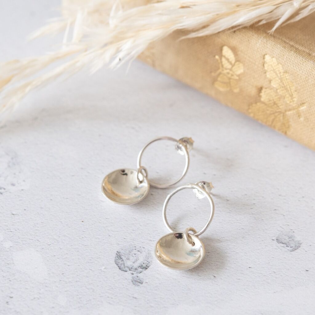 Each pair of earrings is handcrafted in my Northumberland studio. The discs are cut from sheet metal, before being hammered for texture and formed into lightly domed shapes. The circles are hand formed from silver wire and the posts are soldered on. A final polish brings the earrings to life, giving them a striking, highly reflective finish which really captures the light as they move.