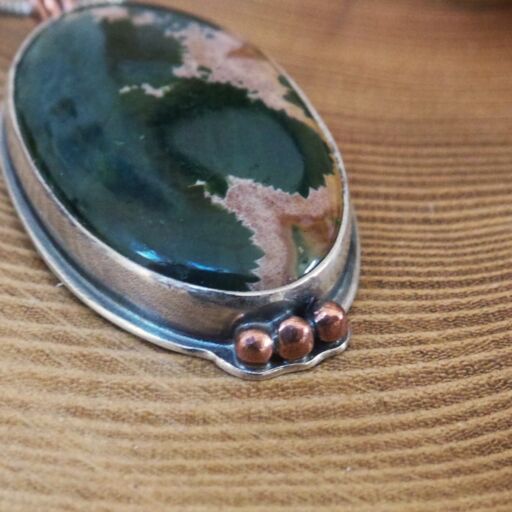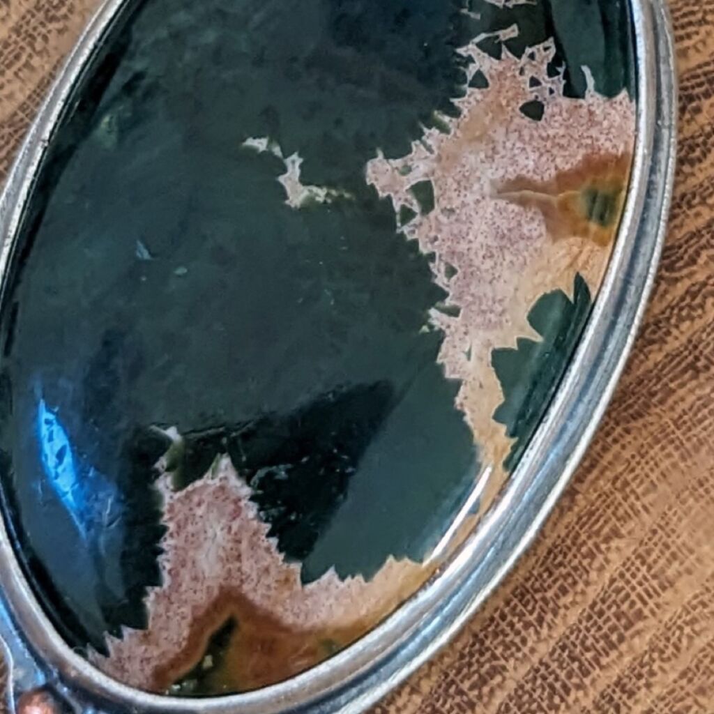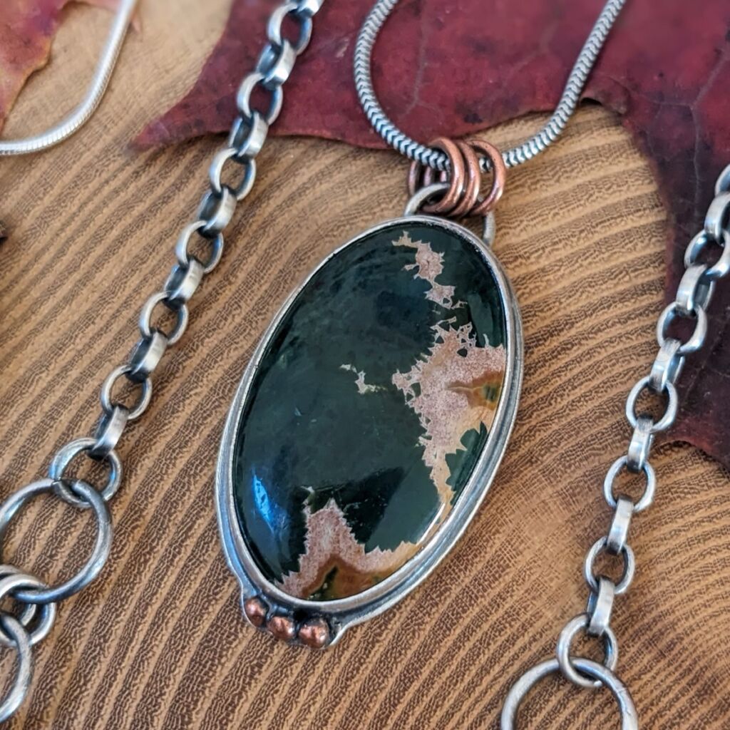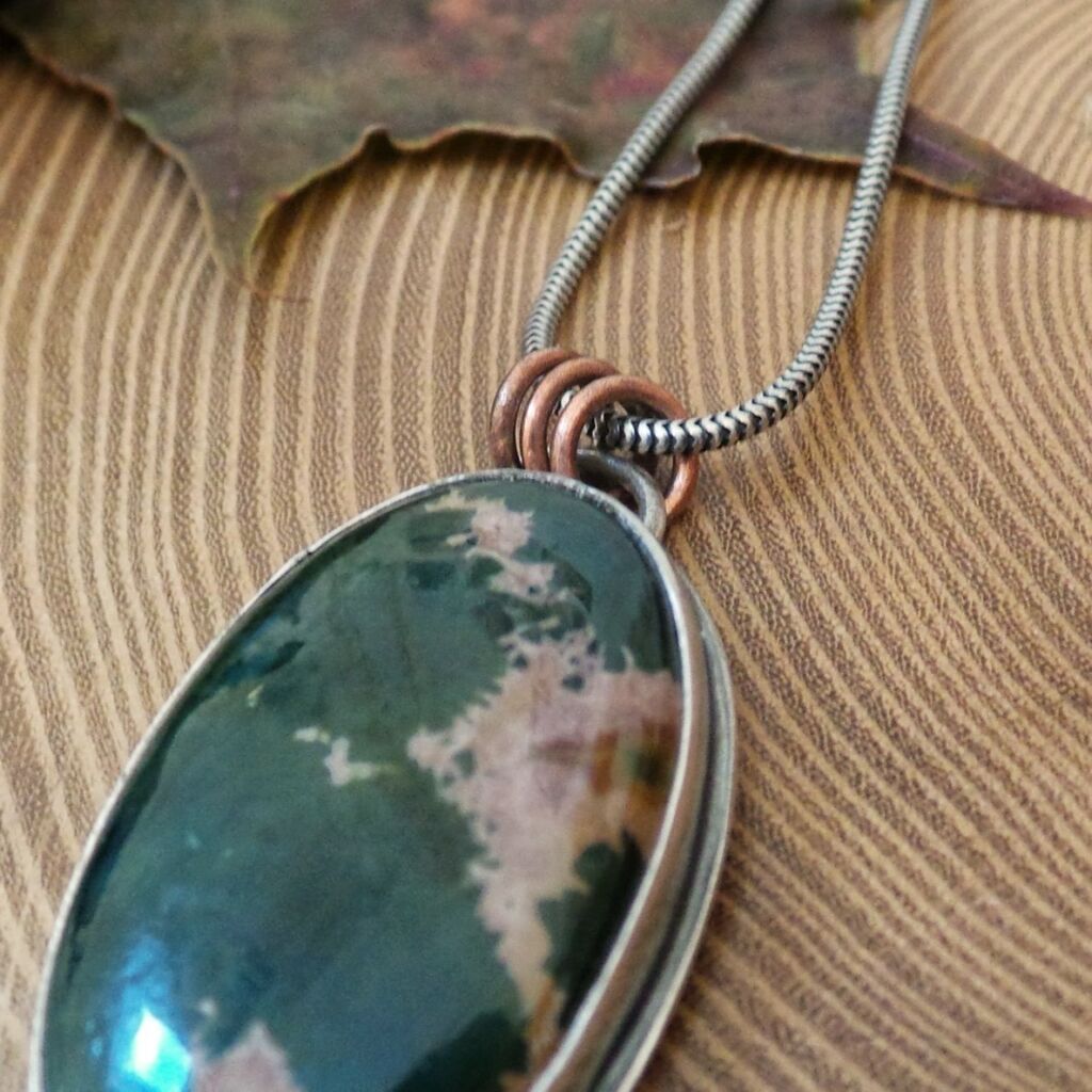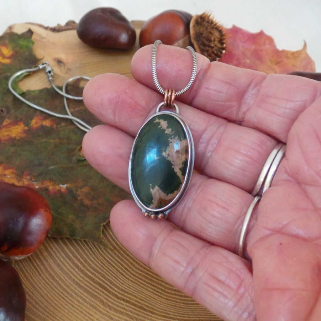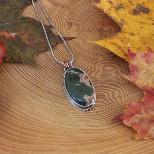 This striking necklace features a highly polished Ocean Jasper cabochon, set in sterling silver. The colours and patterns of the stone echo perfectly the rust-coloured markings on early Autumn leaves, and are complemented by copper accents in the setting.