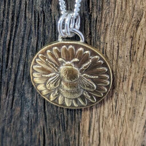 This lovely pendant features a bee and daisy design which has been impressed into a nugget of recycled brass. The impression has a wonderfully detailed texture which really brings the image to life. The necklace has a nice weighty feel to it (a little over 4g) and hangs beautifully from a sterling silver curb chain.