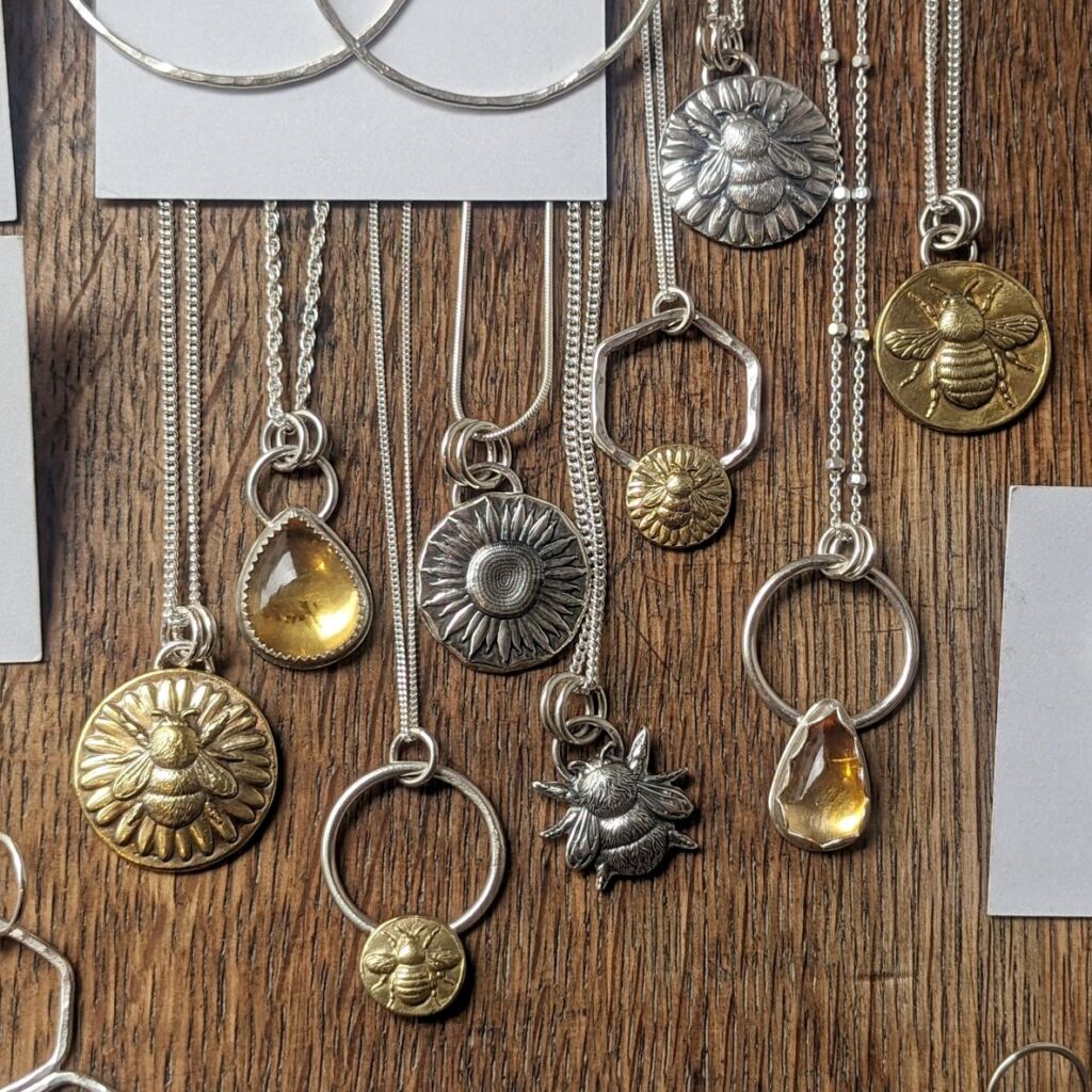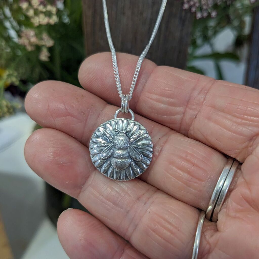 Each bee impression is produced individually me in my studio; there’s no mass production going on here! Firstly I melt down an ingot of brass using the offcuts I keep from other projects. Then I press the shape using an impression die and a hydraulic press. This could be repeated 4 or 5 times before I’m totally happy with the depth and detail of the print, annealing the metal between each stage. Once I think I’ve got the perfect print, I file away the excess material and smooth the edges, before soldering on the bale. The impression gets a light oxidising to really make the details pop before a final polish. And voila!