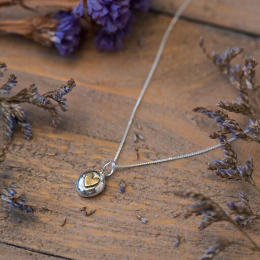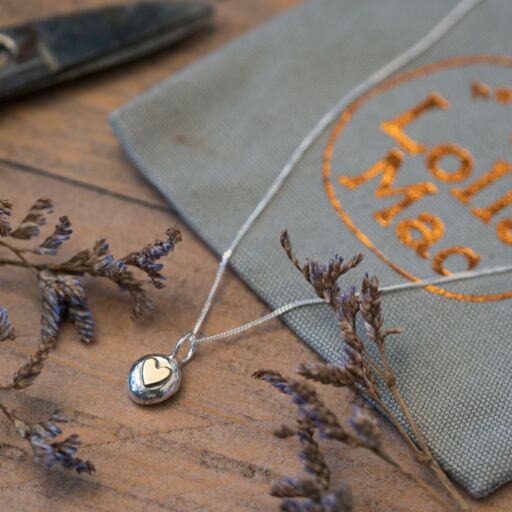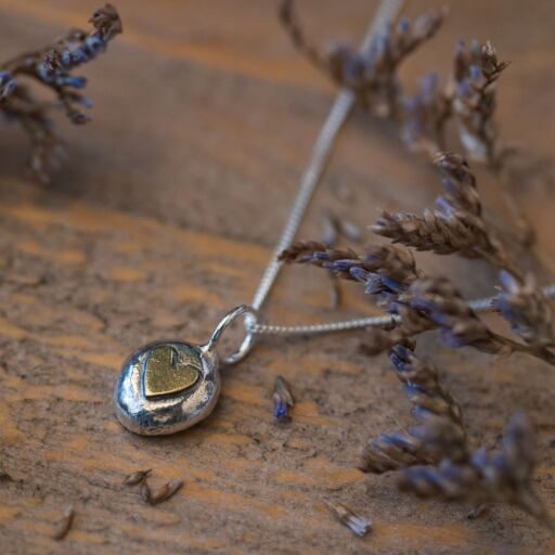 This pretty silver and brass heart pendant has been made from a free formed pebble of sterling silver. The pebble is topped with a brass heart which has been cut freehand from my metal offcuts. The silver I melt down is all reclaimed from my own workshop production processes, and includes offcuts, broken chains and mishaps!