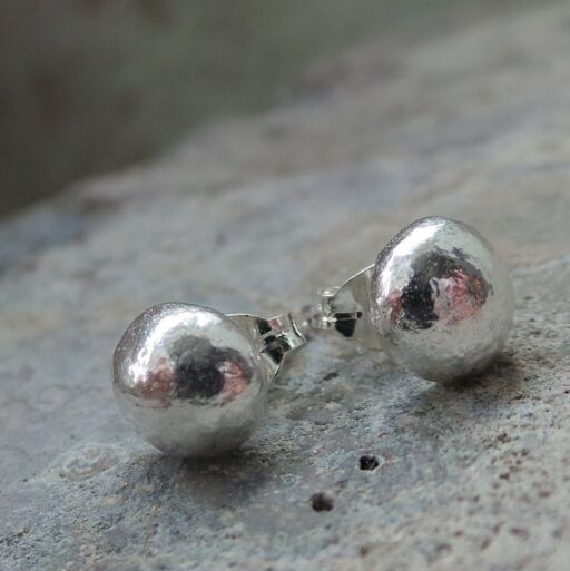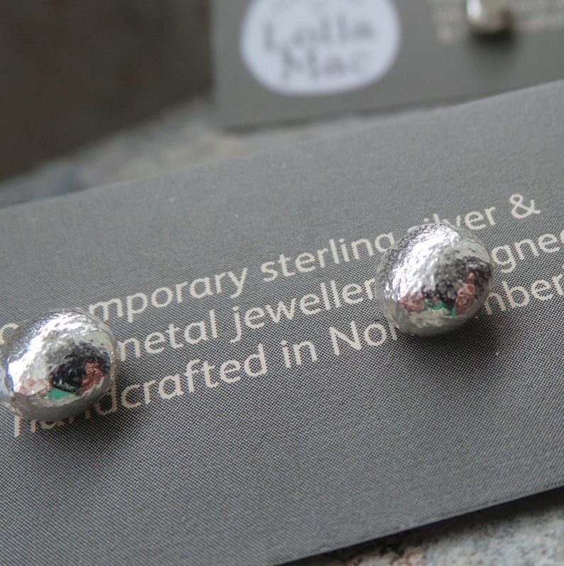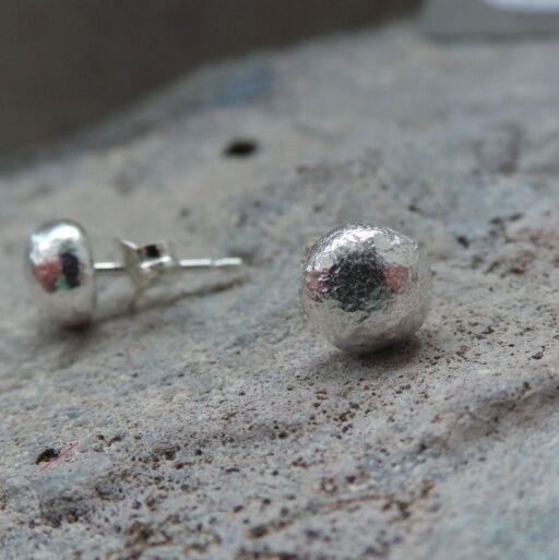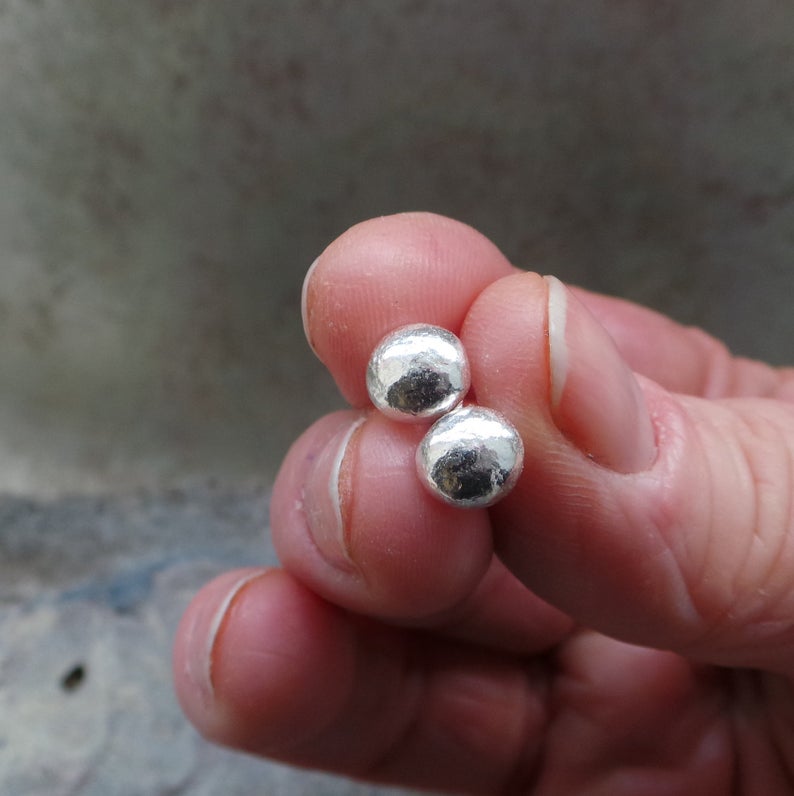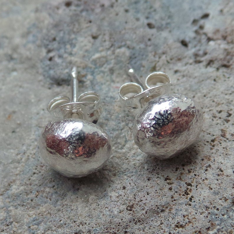 These reclaimed silver pebble studs have been made from melted down offcuts of sterling silver. (None of this precious metal goes to waste in the workshop!) Each pebble is completely free formed and so each one if completely unique! Sometimes the resulting pebble comes out smooth, sometimes a little lumpy, though they are matched as closely as possible within each pair.