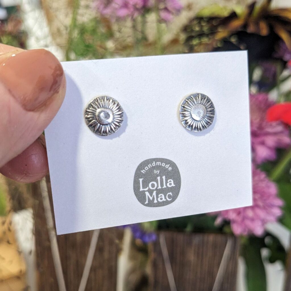 Each sunflower impression is produced individually me in my studio; there’s no mass production going on here! Firstly I melt down an ingot of sterling silver using the offcuts I keep from other projects. Then I press the shape using an impression die and a hydraulic press. For the larger pieces this could be repeated 4 or 5 times before I’m totally happy with the depth and detail of the print, annealing the metal between each stage. Once I think I’ve got the perfect print, I file away the excess material and smooth the edges then solder a sterling silver ear post to the back. The impression gets a light oxidising to really make the details pop before the whole thing gets a final polish. And voila!