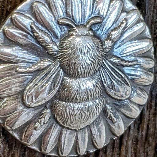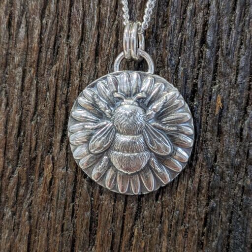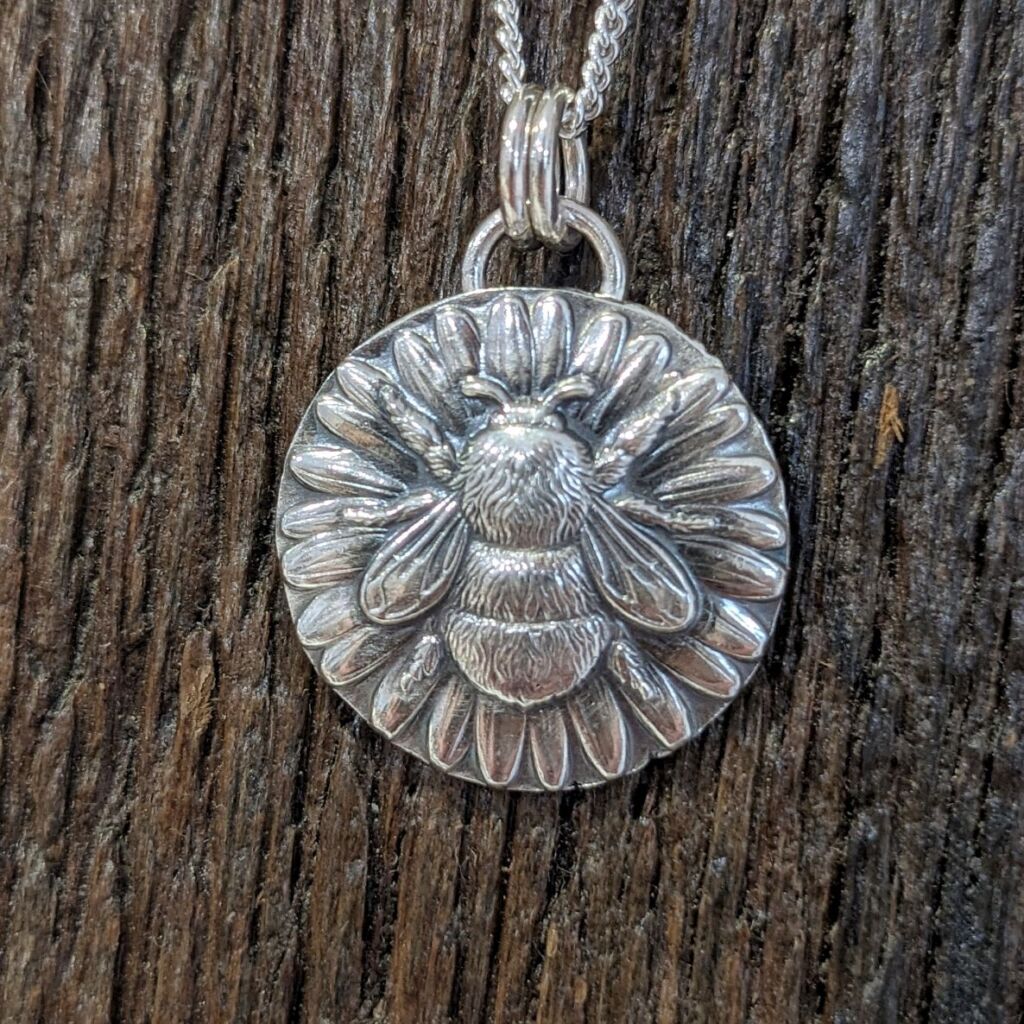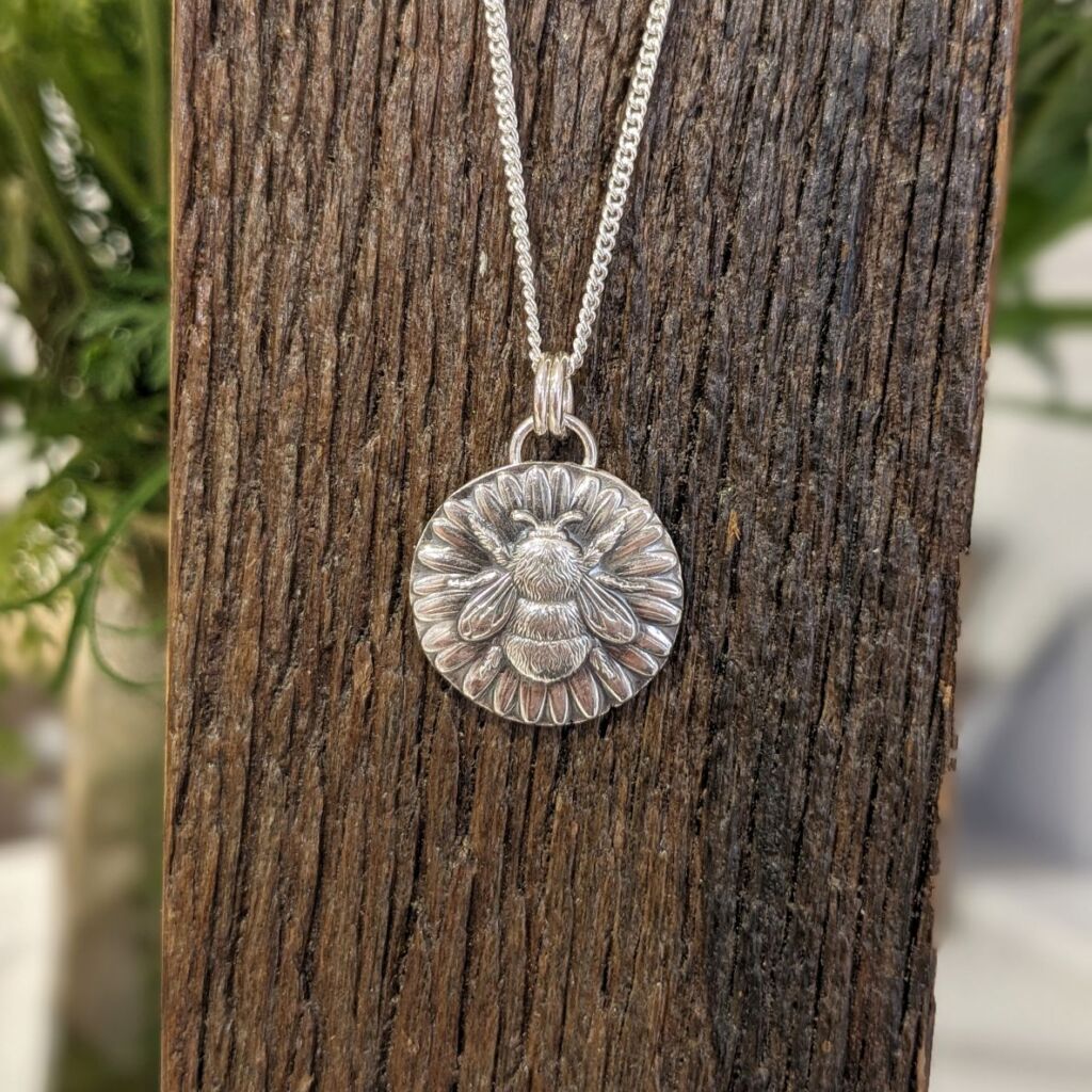 Each bee impression is produced individually me in my studio; there’s no mass production going on here! Firstly I melt down an ingot of sterling silver using the offcuts I keep from other projects. Then I press the shape using an impression die and a hydraulic press. This could be repeated 4 or 5 times before I’m totally happy with the depth and detail of the print, annealing the metal between each stage. Once I think I’ve got the perfect print, I file away the excess material and smooth the edges, before soldering on the bale. The impression gets a light oxidising to really make the details pop before a final polish. And voila!