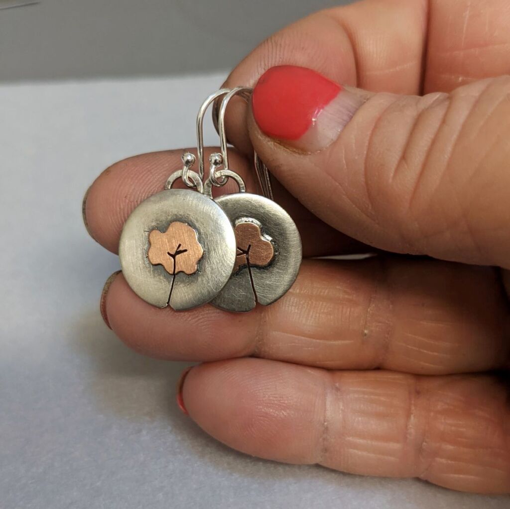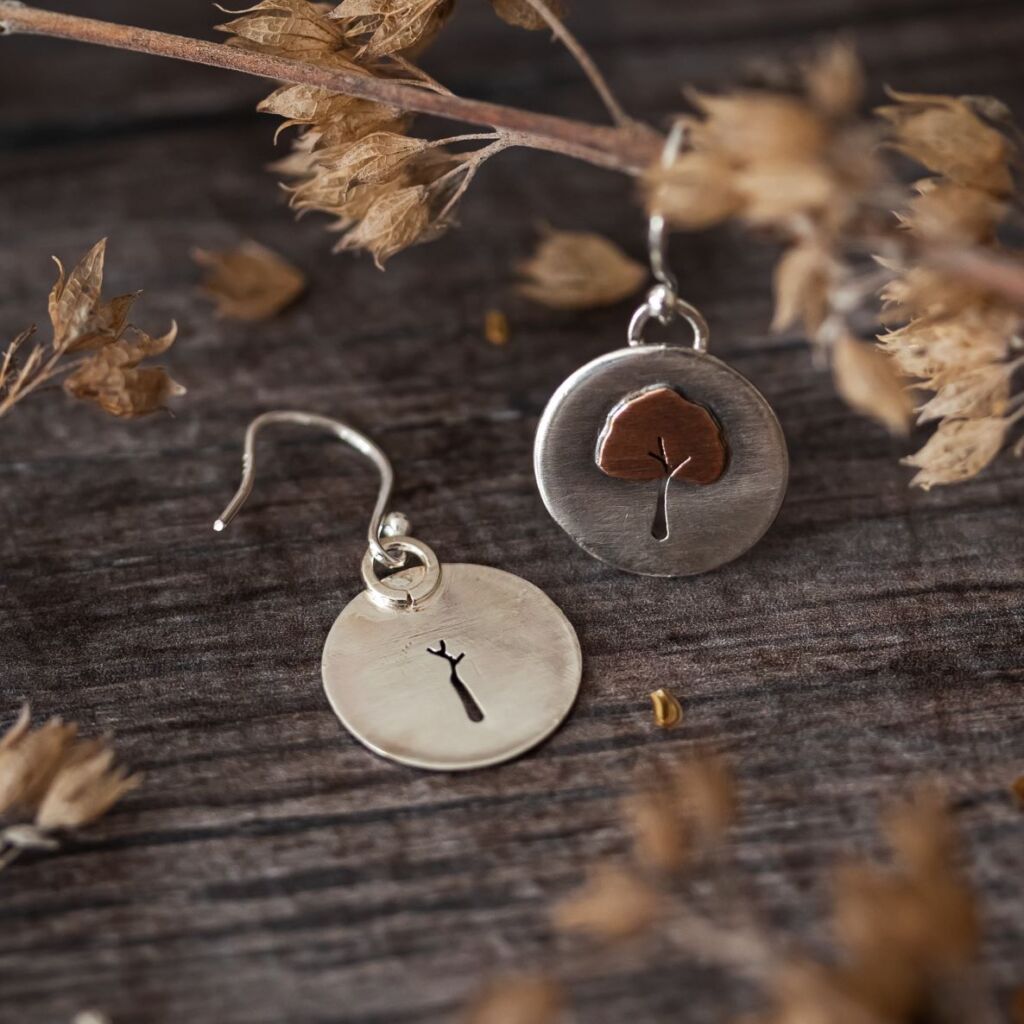 Taking inspiration from the Northumbrian landscape surrounding my studio, these pretty silver & copper tree earrings feature stylised oak trees. The trunk and branches of the trees are created by piercing through the copper and silver layers. Each element is drawn individually and cut out entirely by hand, meaning every earring is completely unique; just like the trees which inspired them!