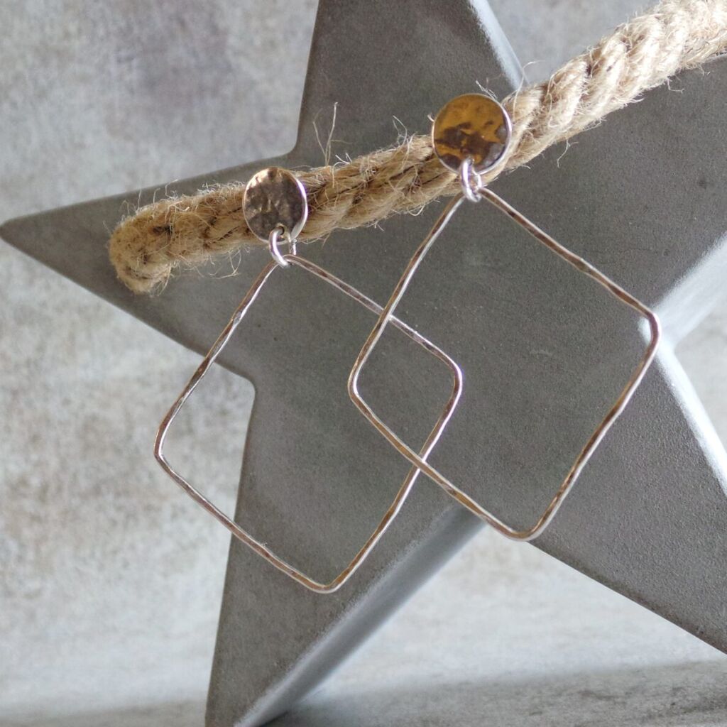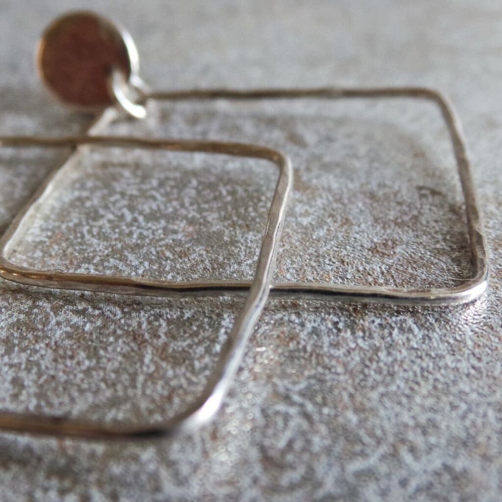 These eye-catching earrings feature a delicate square hoop of sterling silver, hanging from a stud earring. The disc of the stud and and the wire hoop have been gently hammered for texture and some added sparkle. The earrings are ultra lightweight yet still have a lovely dangly movement, and thanks to the stud fastening feel very secure in the ears.
