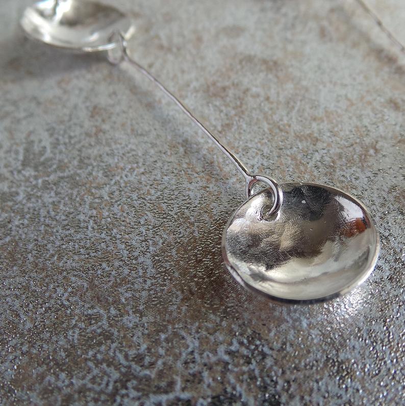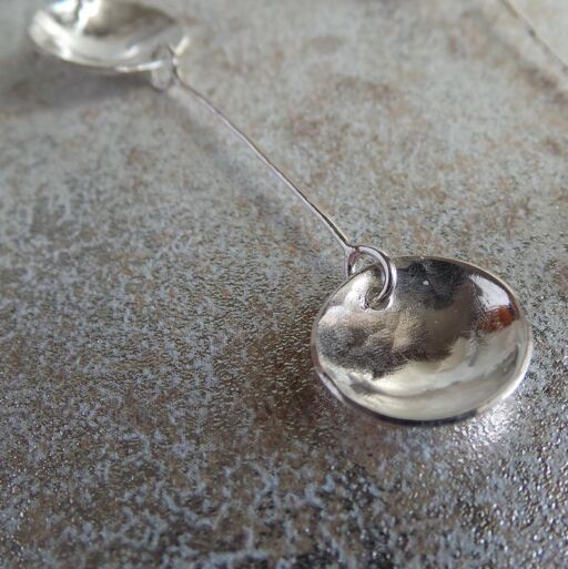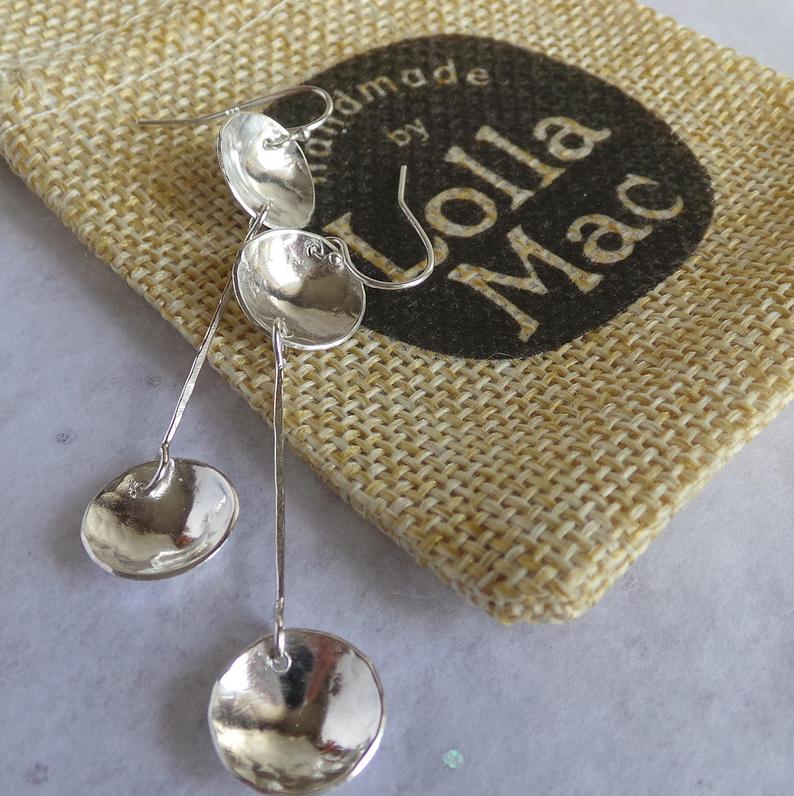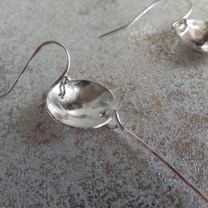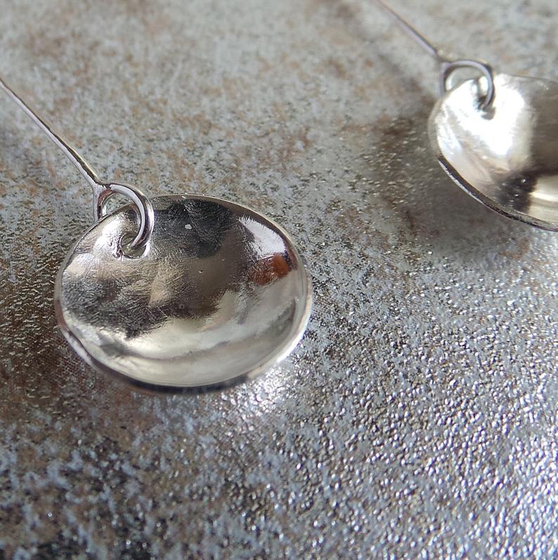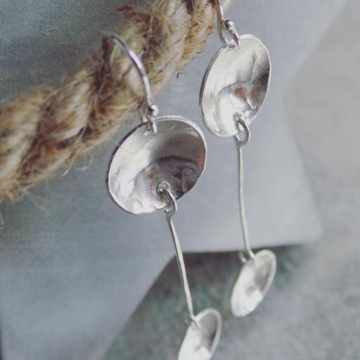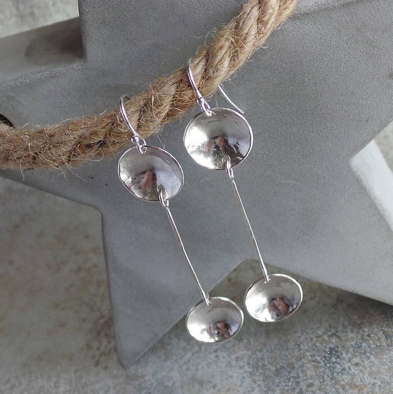 These delicate drop earrings have been handmade from hammered and domed discs of sterling silver, linked via a hand formed and textured silver stem and hanging from a sterling silver ear wire. They are incredibly lightweight and very easy to wear, yet have a striking appearance due to their lovely movement and dangle.