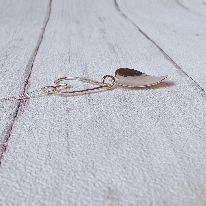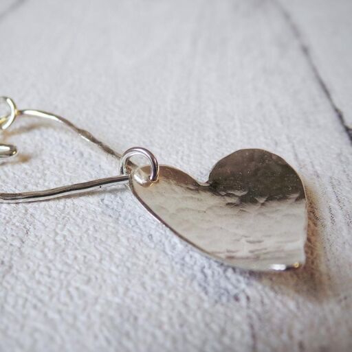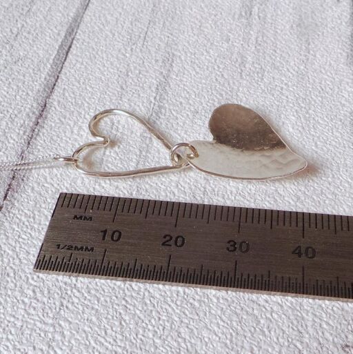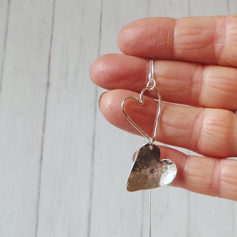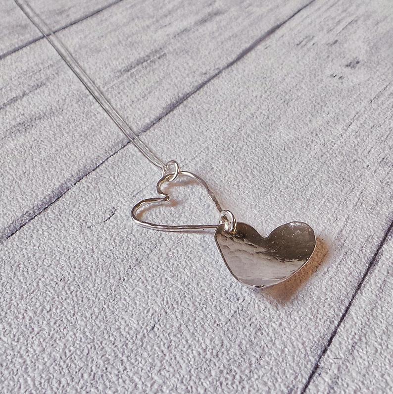 This pretty pendant features two connected sterling silver hearts; one hand-formed from silver wire and the other hand-cut from silver sheet. Both have been hammered for texture and the solid heart has been slightly domed for added detail. The pendant hangs from a fine sterling silver chain.
