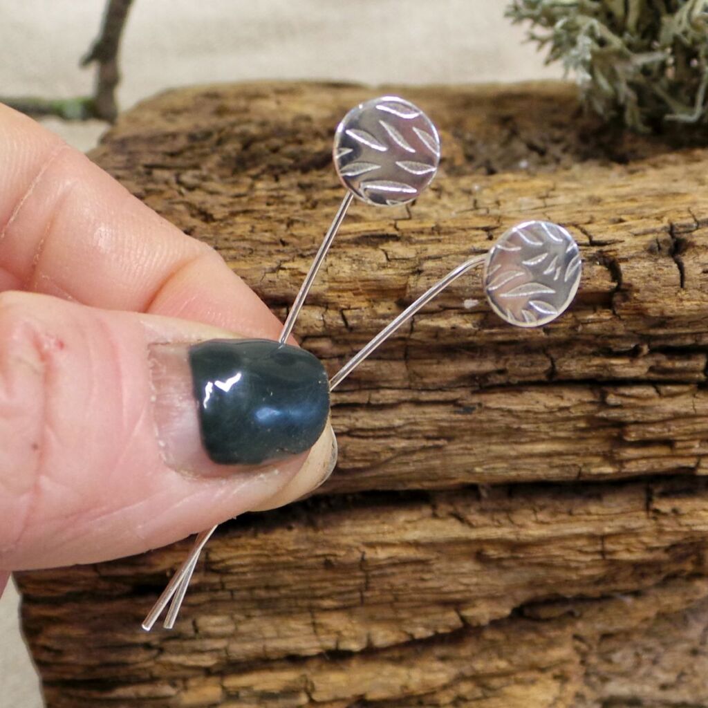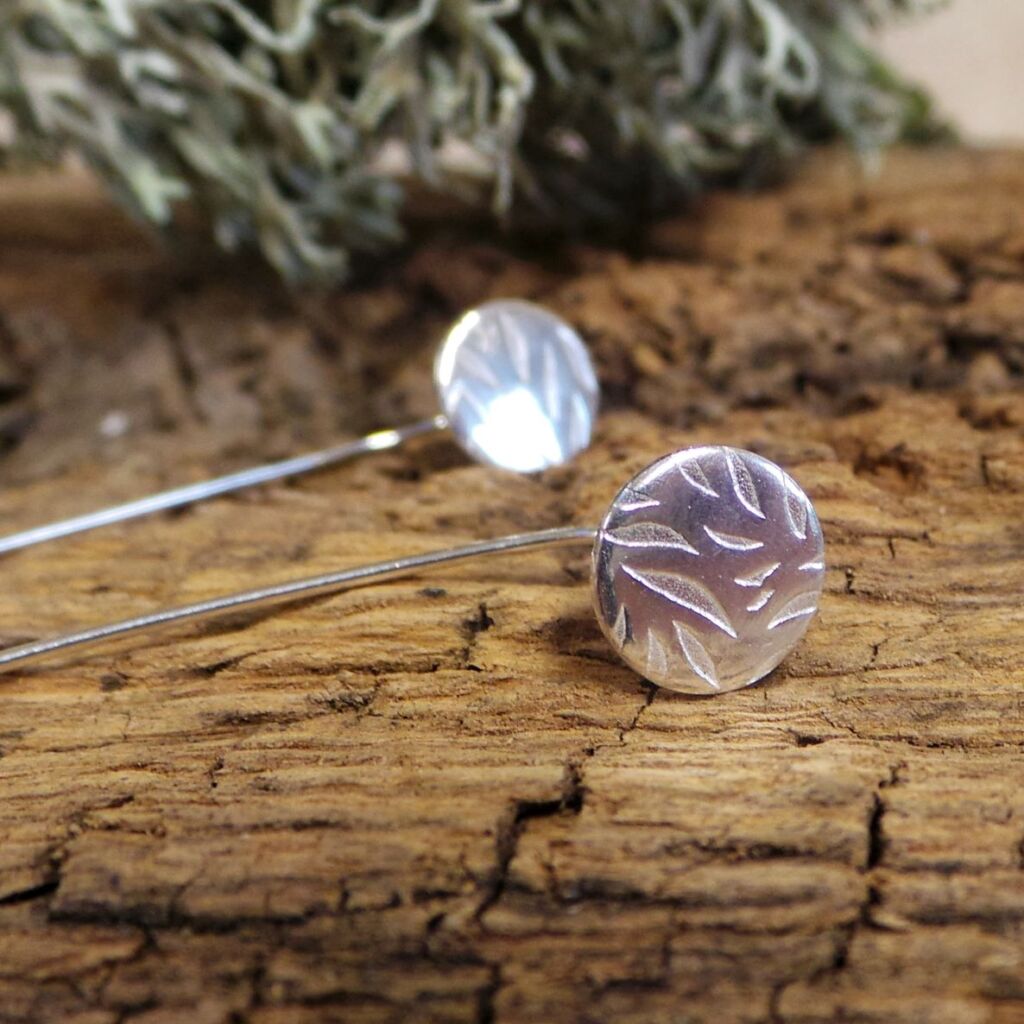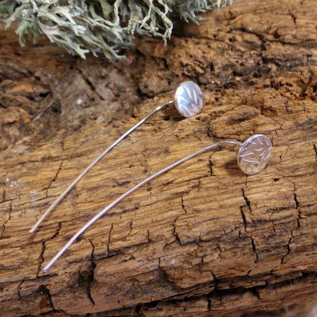 These sterling silver ear threader studs are a contemporary twist on the traditional stud earring style. Handmade by me from sterling silver, the long tailed stem threads through the ear and the textured stud sits perfectly on the ear lobe. The circular disc stud is textured with a leaf style pattern.