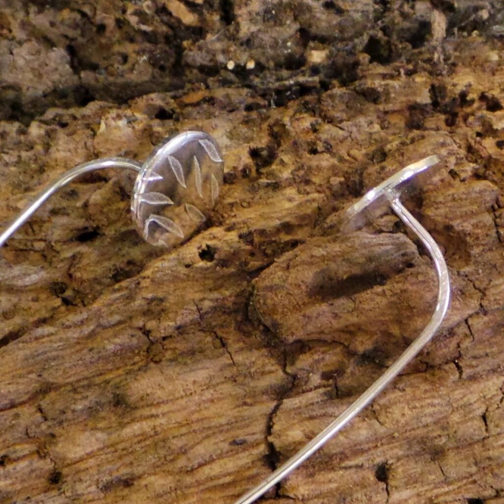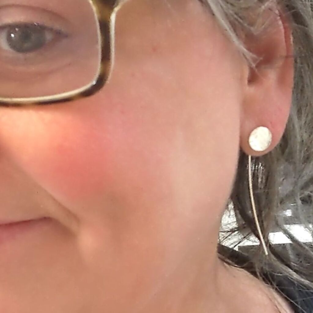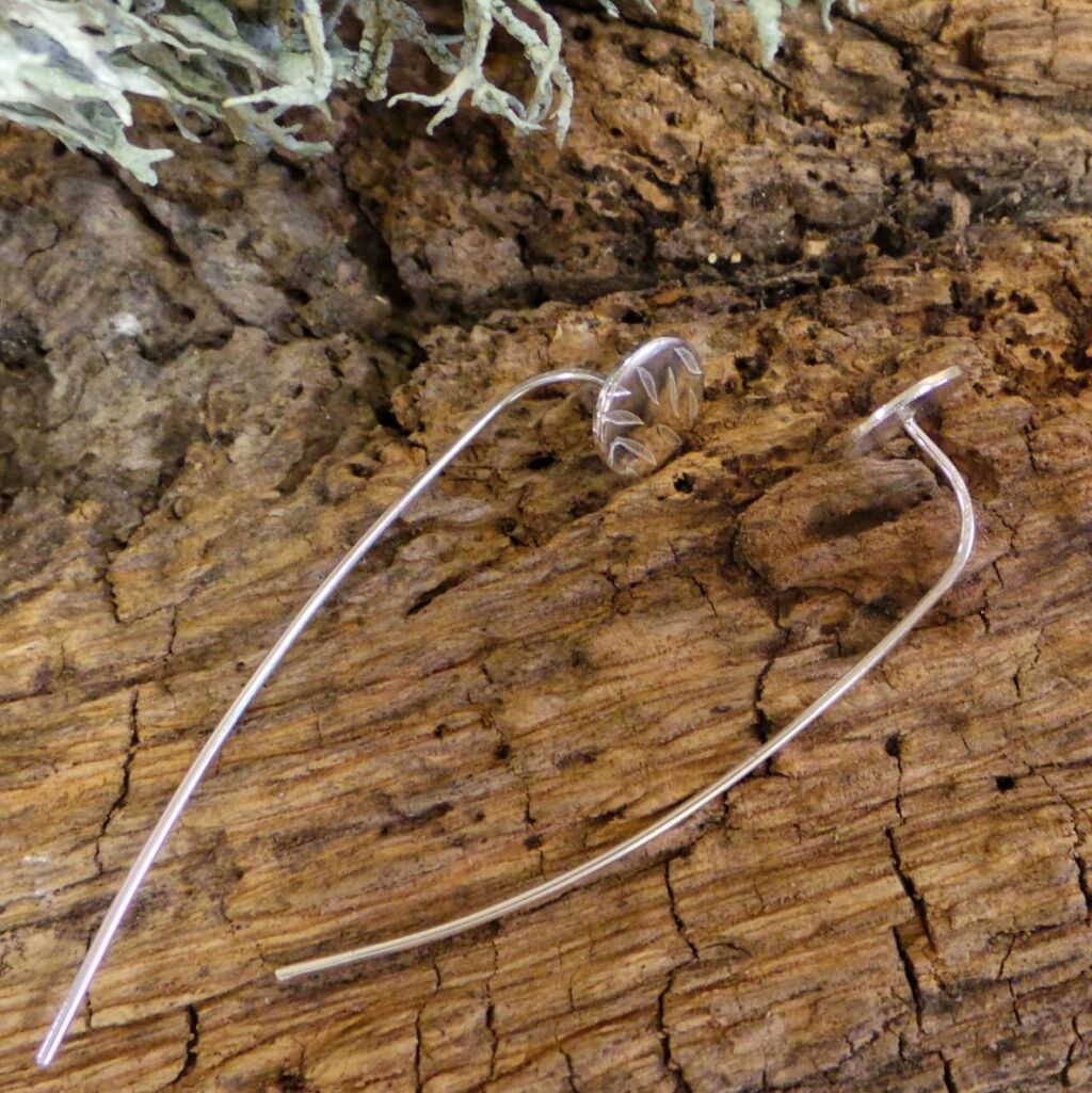 These sterling silver ear threader studs are a contemporary twist on the traditional stud earring style. Handmade by me from sterling silver, the long tailed stem threads through the ear and the textured stud sits perfectly on the ear lobe. The circular disc stud is textured with a leaf style pattern.
