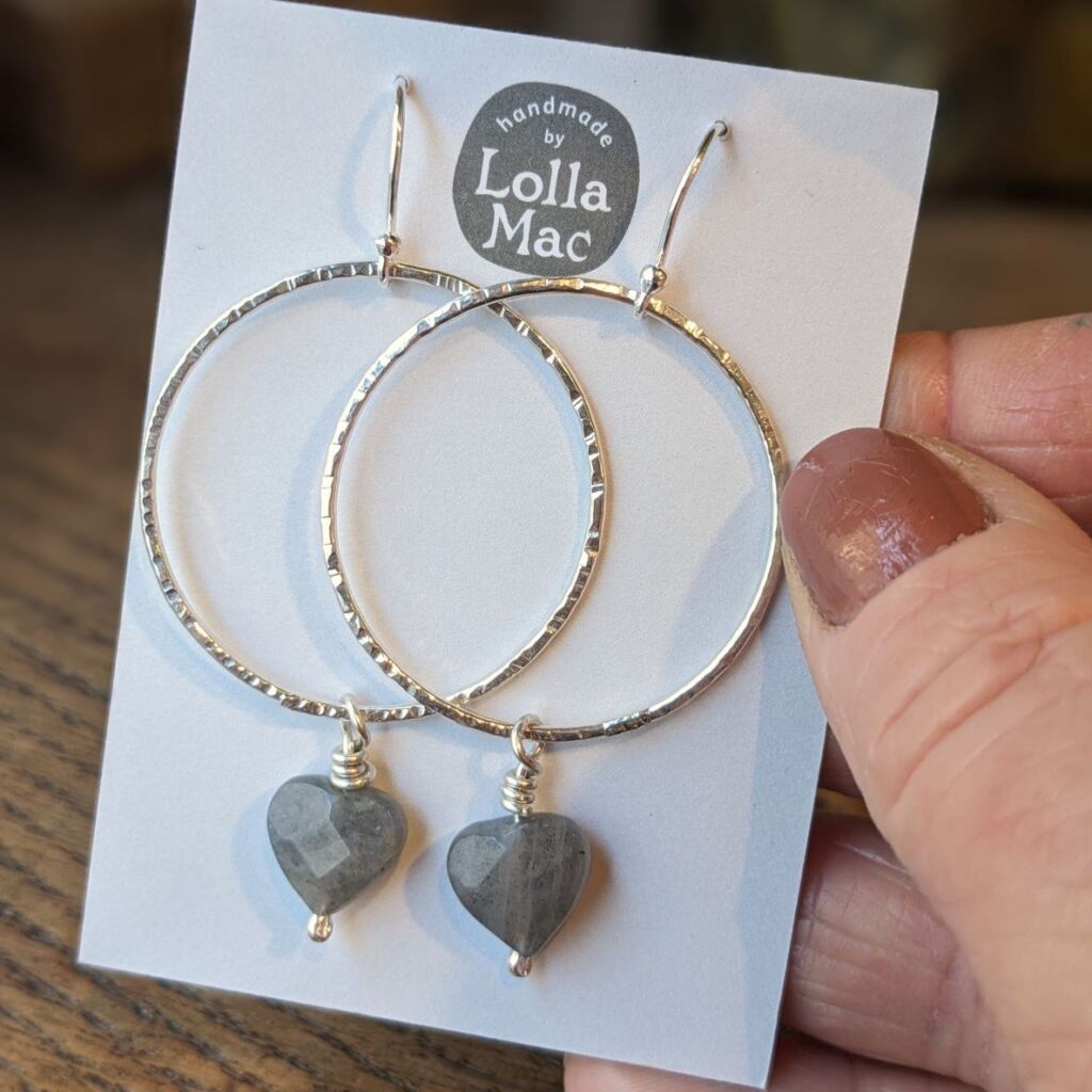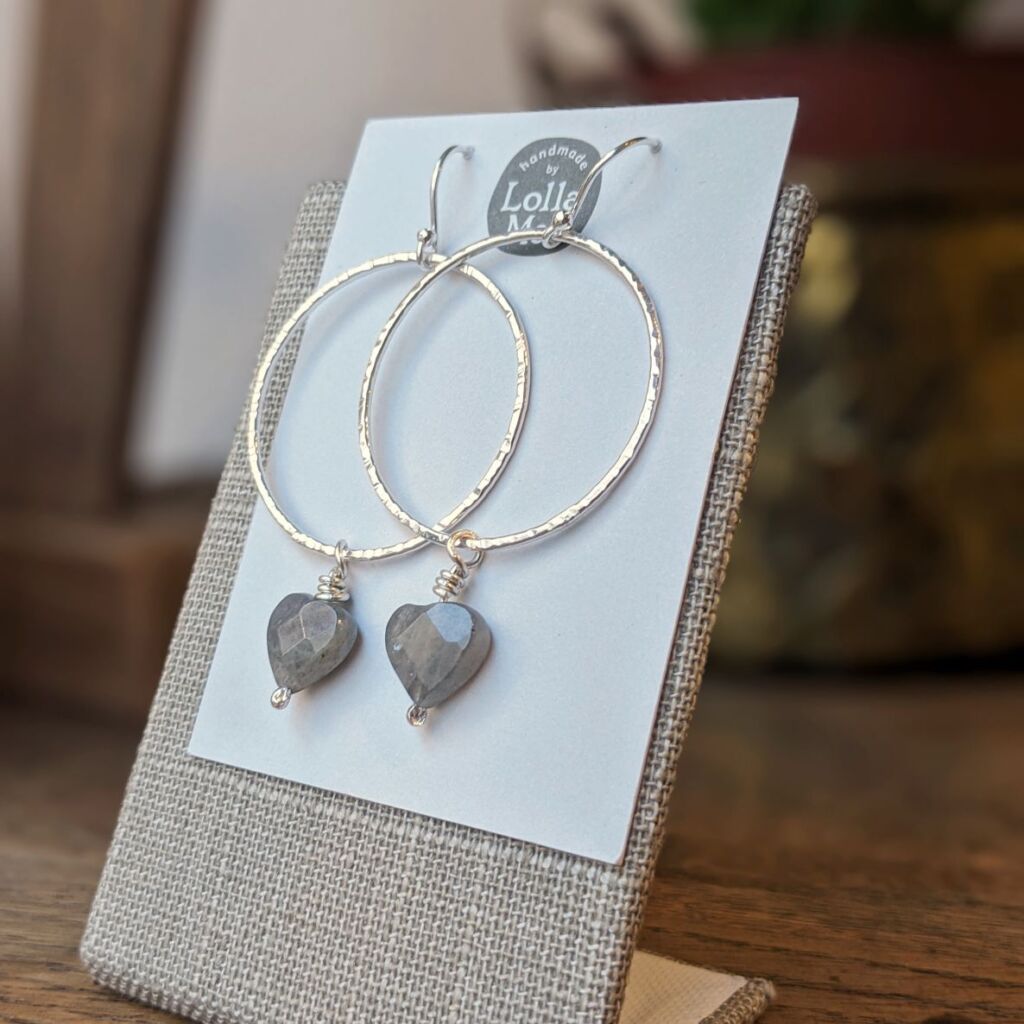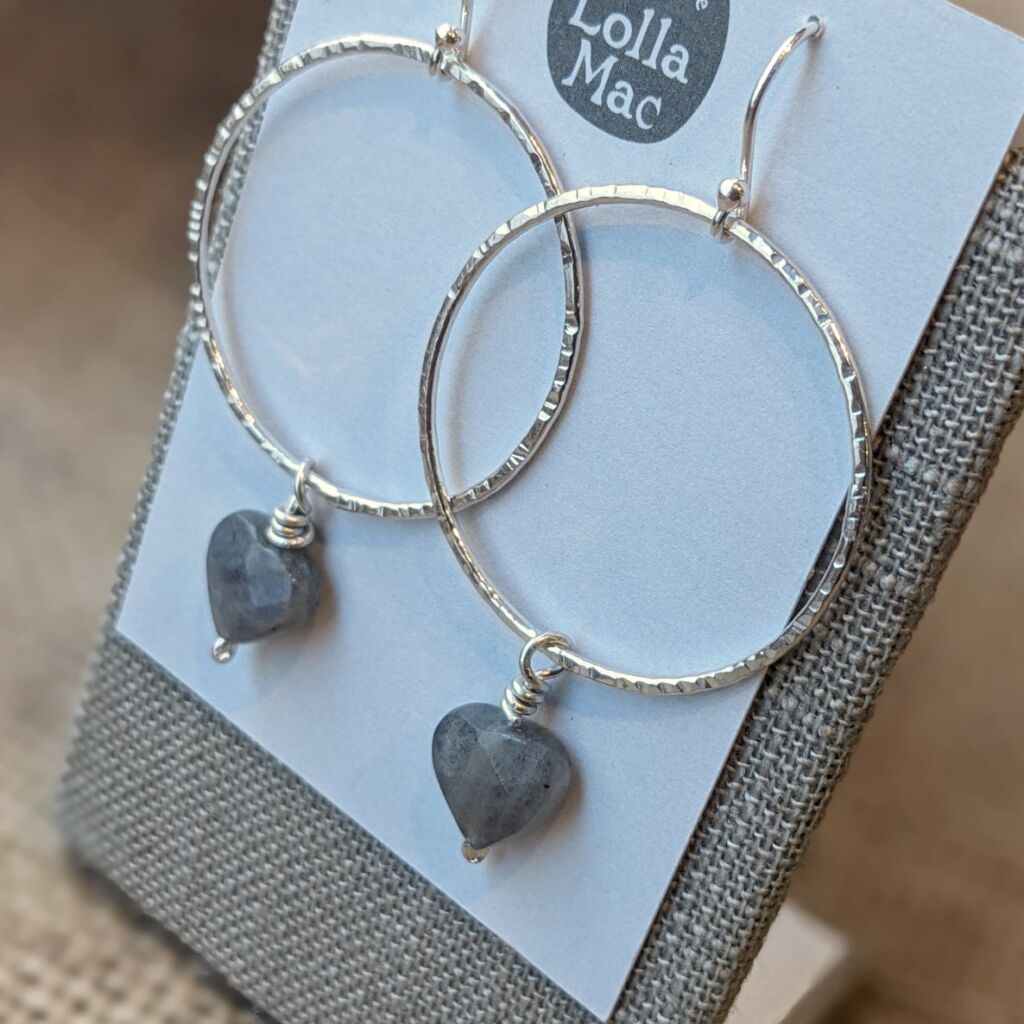 These pretty dangly hoops feature a textured sterling silver hoop with a heart shaped labradorite gemstone charm. They have a lovely dangly, whilst being very lightweight and super easy to wear. These earrings would make a beautiful gift for Valentine’s, Mother’s Day, or just because!