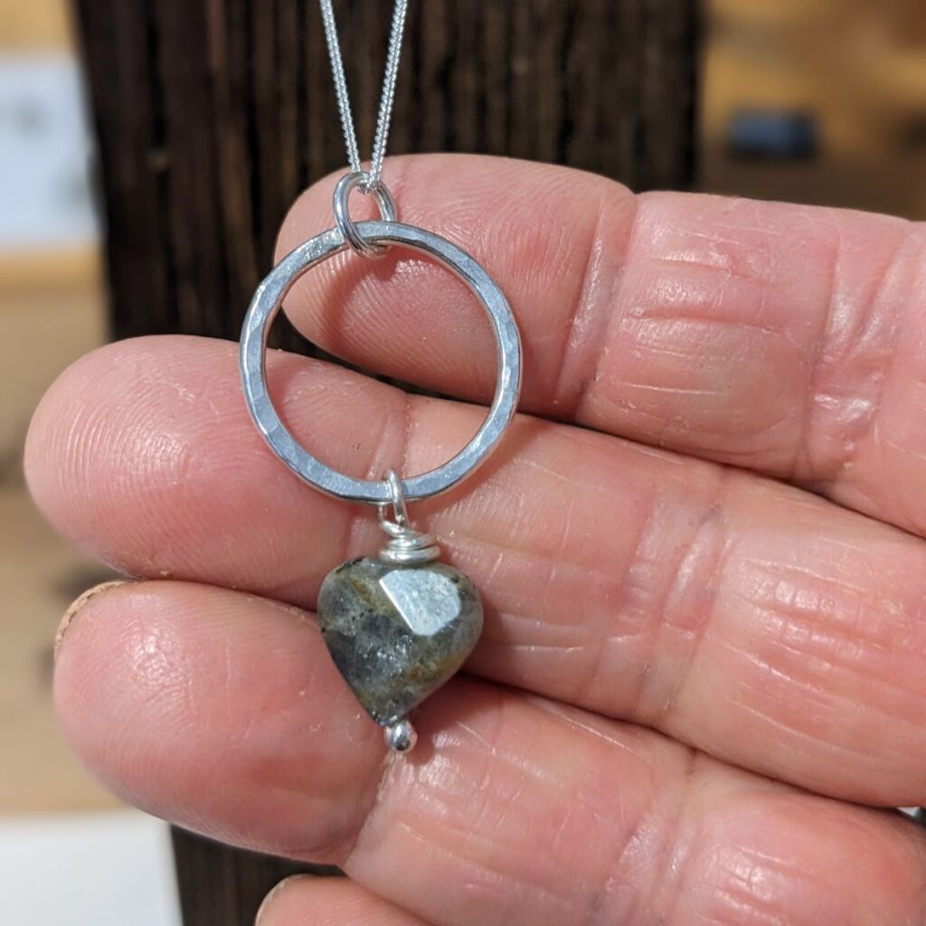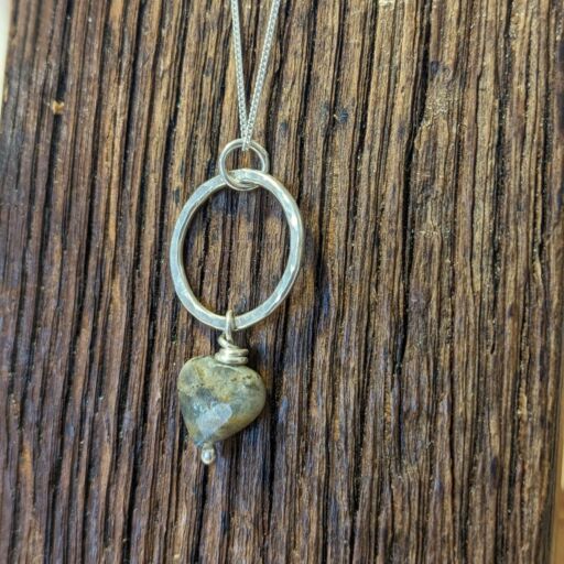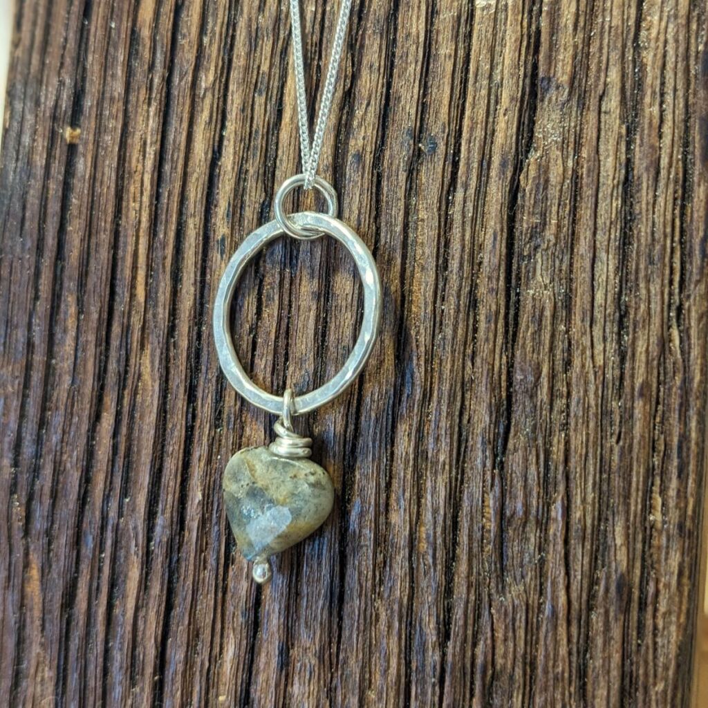 This pretty necklace features a textured sterling silver circle with a heart shaped labradorite gemstone charm. It has a lovely delicate dangle, making it super easy to wear day to day. If you are looking for a beautiful Valentine’s, Mother’s Day, or ‘just because’ gift, this pendant would be the perfect choice!