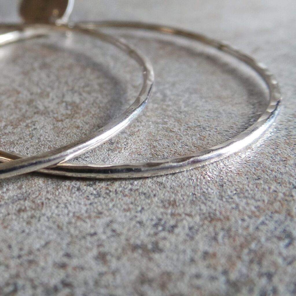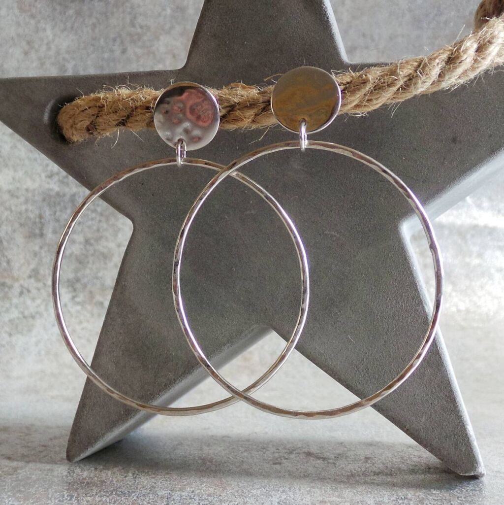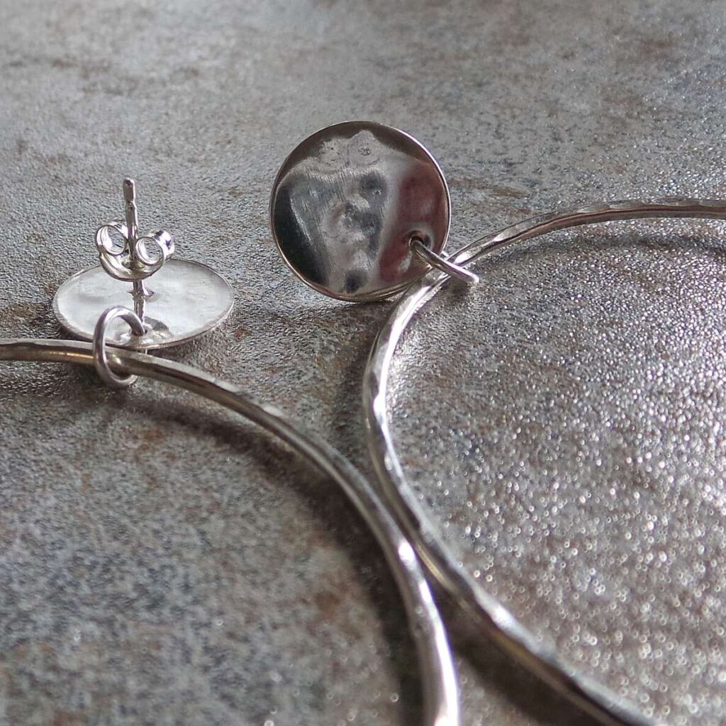 These statement earrings feature a circular hoop hanging from a stud earring, all handmade from sterling silver. Both the wire hoop and the stud have been gently hammered for texture and some added sparkle. Despite their fabulous eye-catching dangly movement, the earrings are still lightweight and easy to wear thanks to the secure stud fastening.