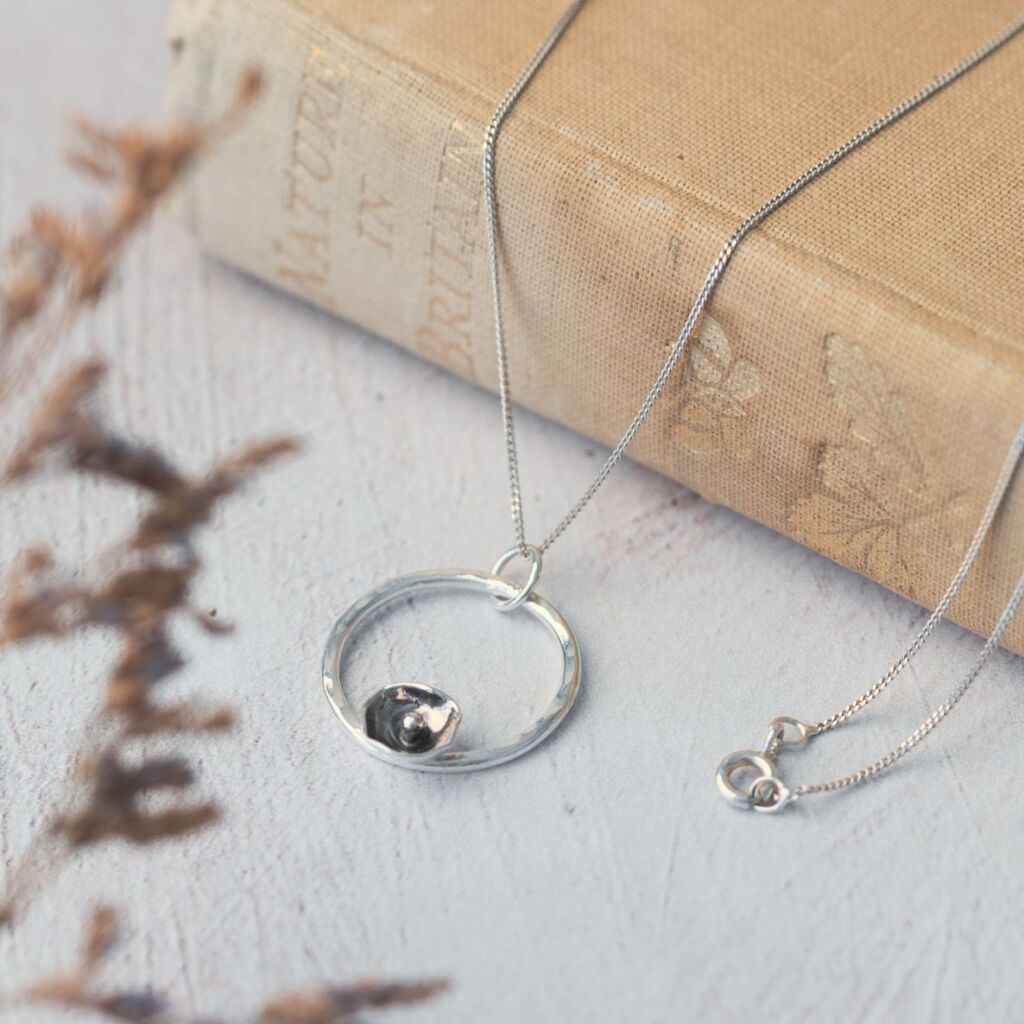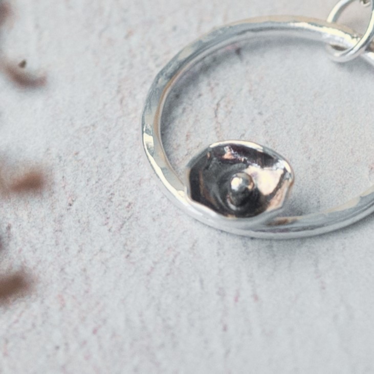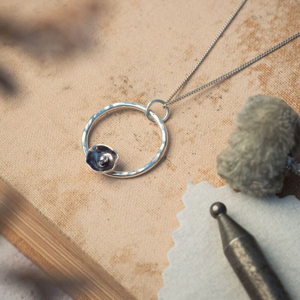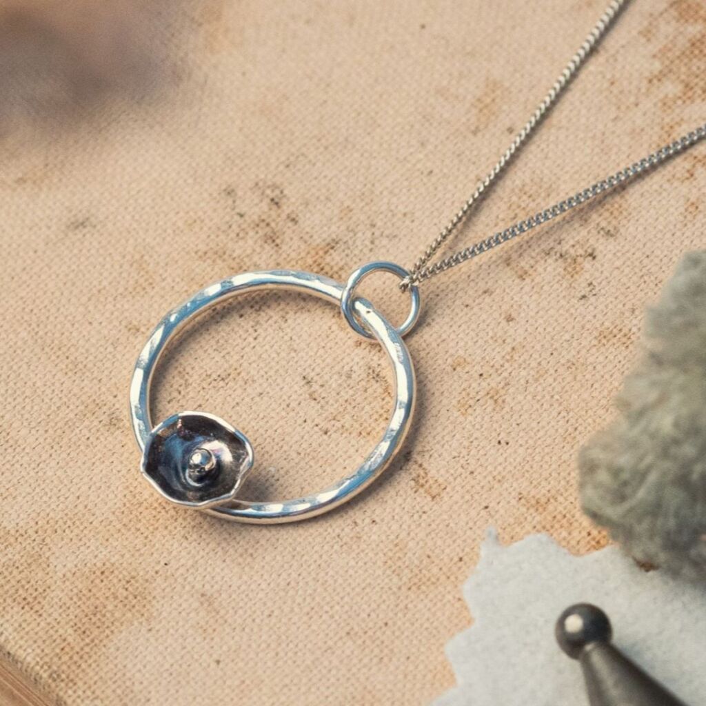 Inspired by floral designs, this pretty sterling silver floral hoop pendant has been entirely handcrafted from sheet metal and wire. The single mini bloom has been hand formed from sterling silver and sits on a sterling silver circle which has been gently hammered for texture. The centre of the flower has been lightly oxidised to create depth and enhance the texture. The pendant hangs from a delicate sterling silver chain.