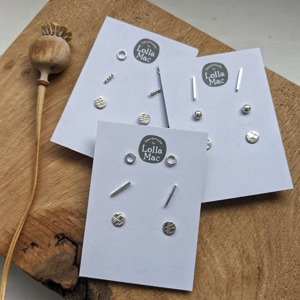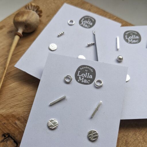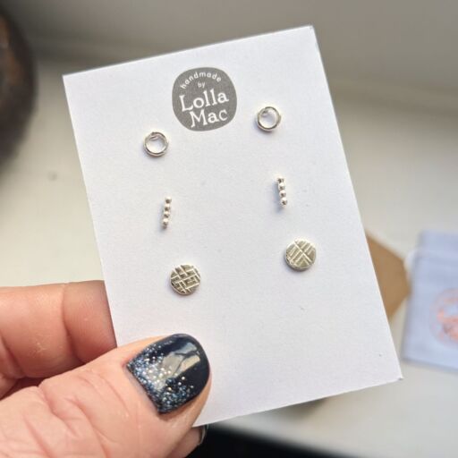 Keep your options open with not just one, but three pairs of these cute earrings! Each of these mini stud trio packs comes with three pairs of handmade sterling silver stud earrings, selected ‘lucky dip’ style from current stock. They are perfect for an understated, everyday look, or for teens or younger children’s ears. Wear them individually or stack them in multi-pieced ears! These earring trios would make a great gift idea.