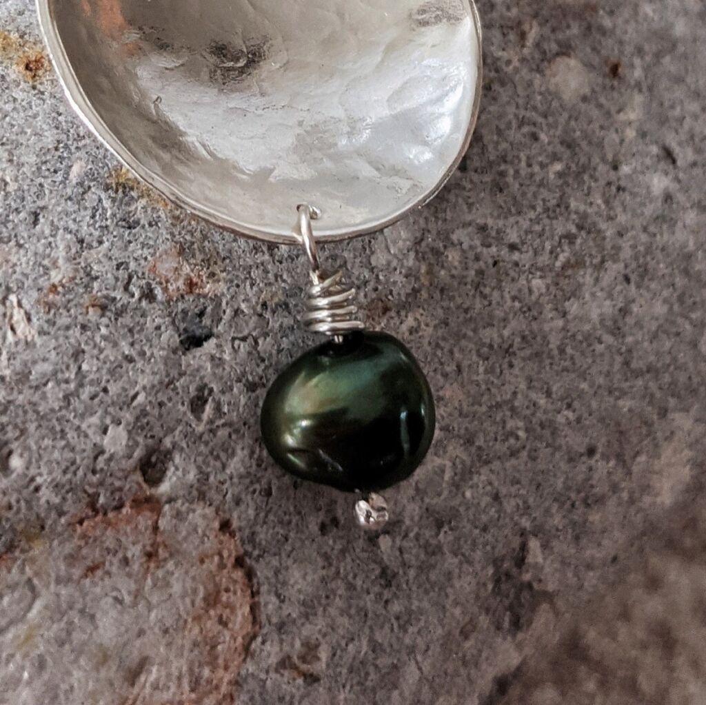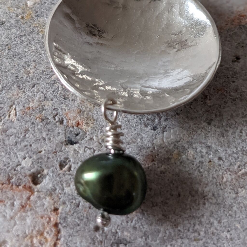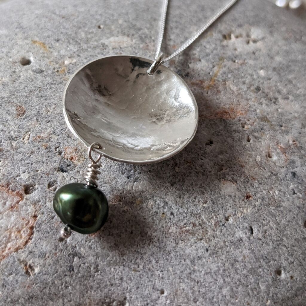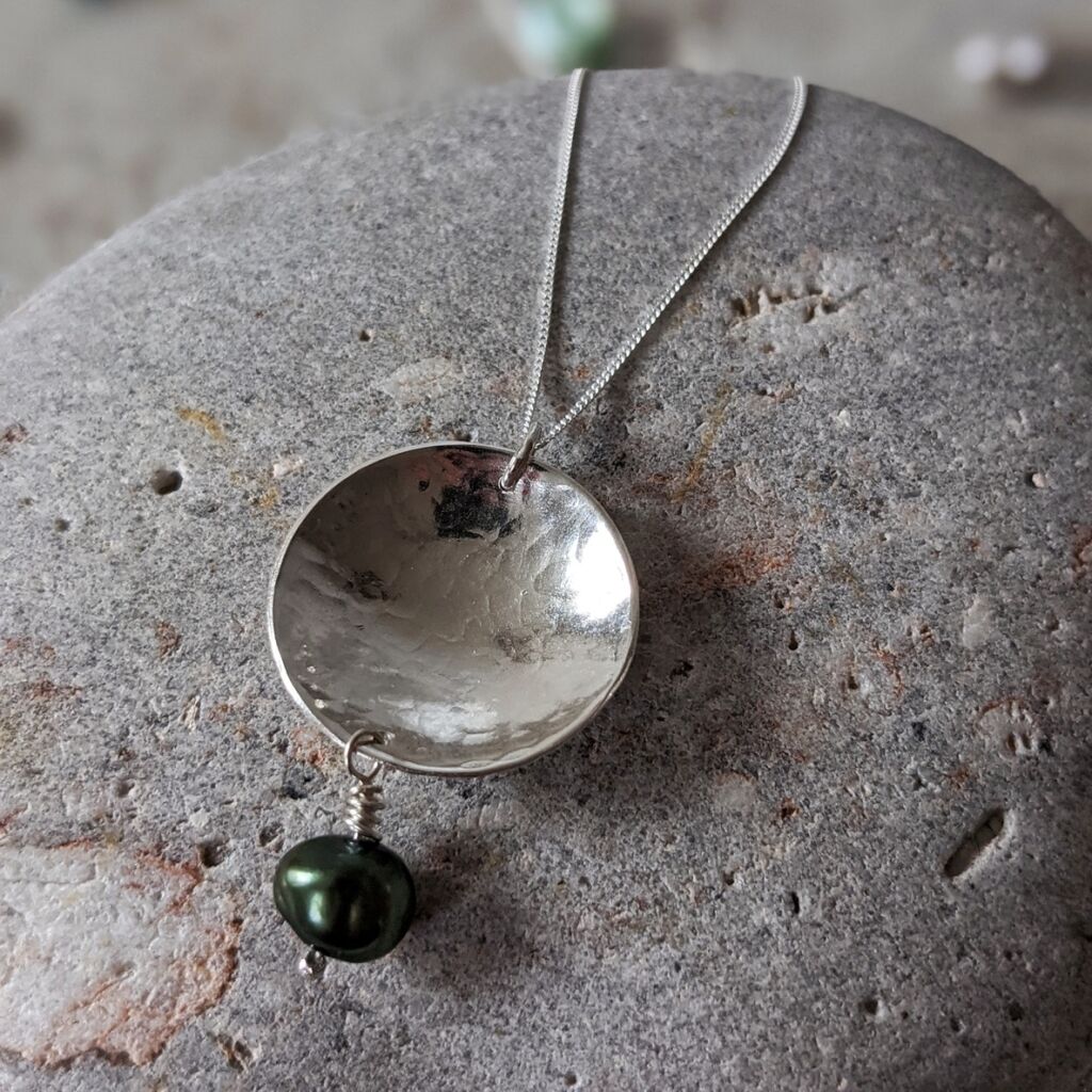 This silver and pearl drop pendant has been made from a hammered and slightly domed silver disc and wire-wrapped freshwater cultured pearl. The pendant hangs from a delicate sterling silver chain. You can customise your pendant with your choice of pearl colour! The hammered and polished surface of the silver gives a faceted effect and really makes the necklace sparkle. It will dress up any outfit, whilst still being lightweight and delicate enough for everyday wear. This necklace would be particularly beautiful worn as bridal jewellery.