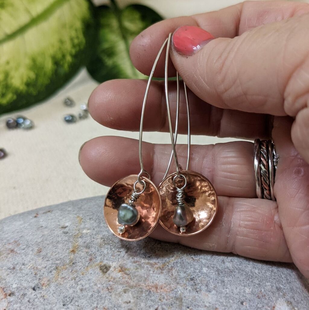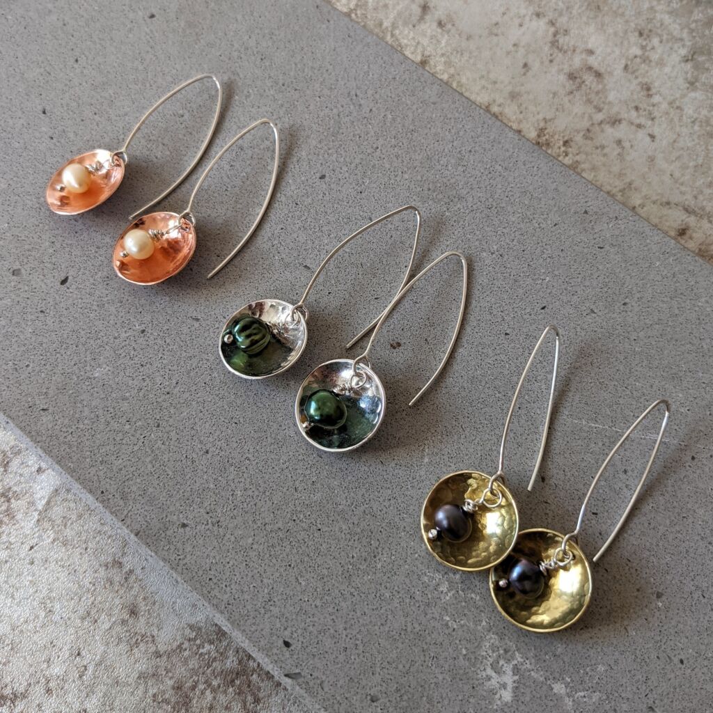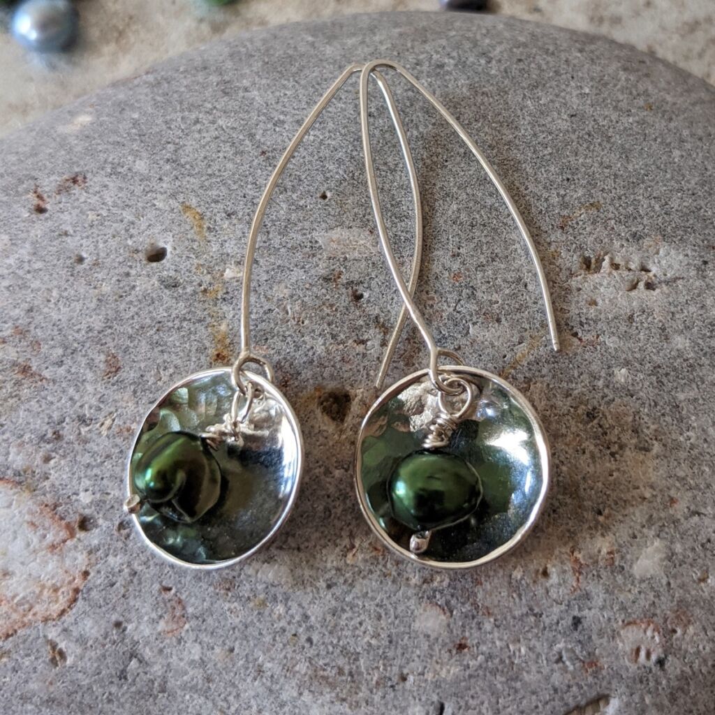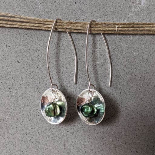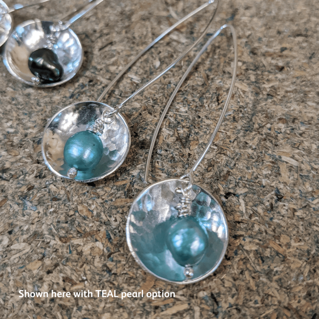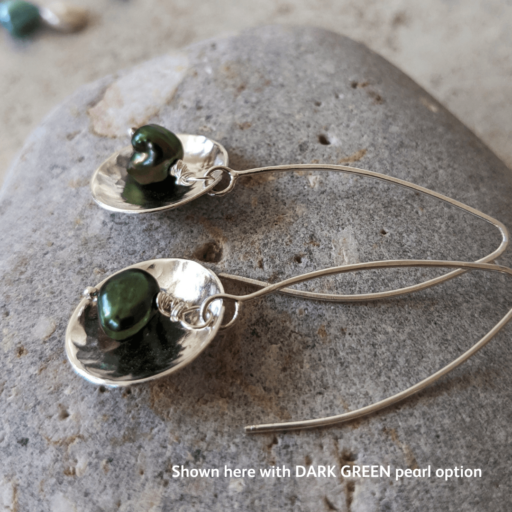 These silver and pearl long drop earrings have been made from hammered and slightly domed silver discs and freshwater cultured pearls. They are nestled together and hang from elongated sterling silver eliptical er wires. You can customise your earrings with your choice of pearl colour! The hammered and polished surface of the silver gives a faceted effect and really makes the earrings sparkle. They will dress up any outfit, whilst still being lightweight and delicate enough for everyday wear. These earrings would make particularly beautiful bridal jewellery.