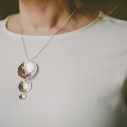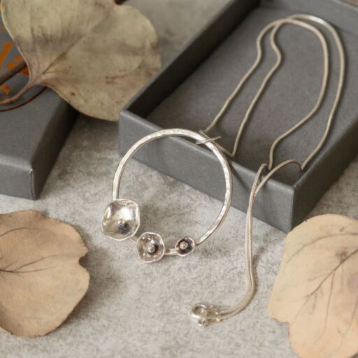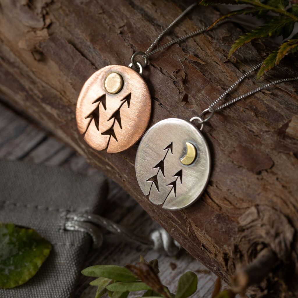 This beautiful silver pine forest pendant was inspired by the landscape and dark skies of Kielder Forest in Northumberland. The pine tree shapes have been created by piercing through sterling silver, creating a cut-out design. Each tree is drawn individually and cut out entirely by hand using a jewellers’ piercing saw, meaning every pendant is completely unique; just like the trees which inspired them! The dark skies inspiration is completed with a brass moon, and a lightly oxidised and brushed finish.