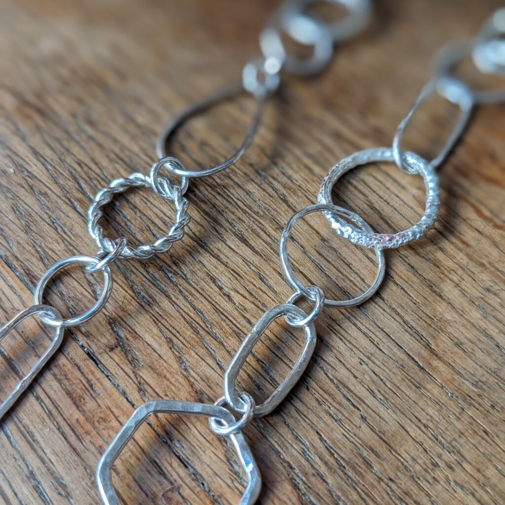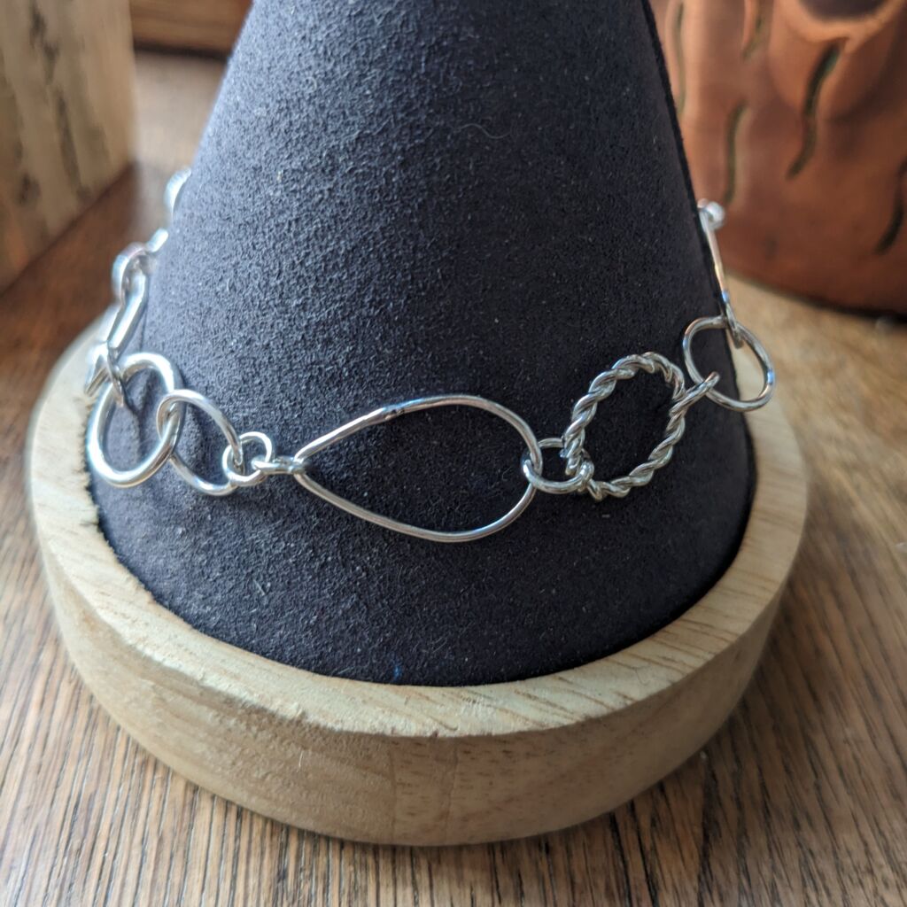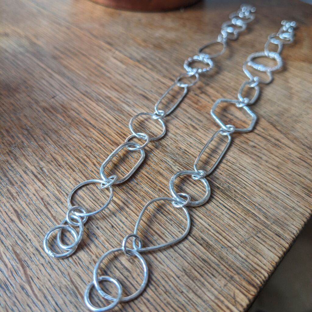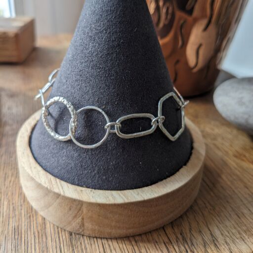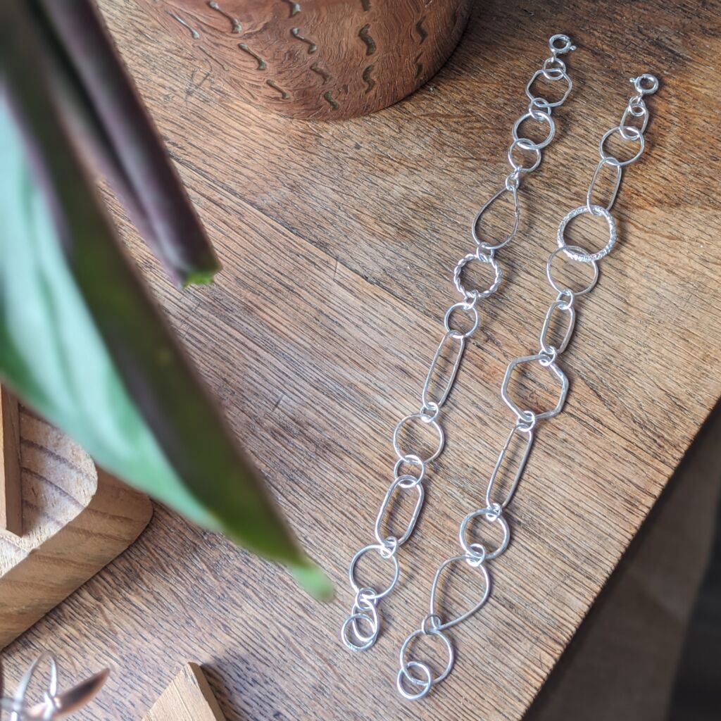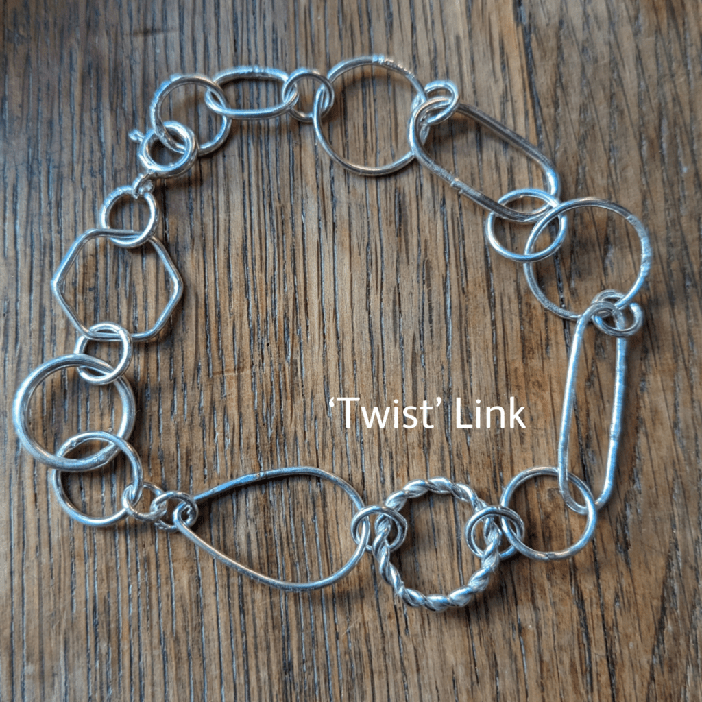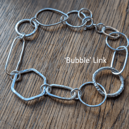 These fabulous chain bracelets are real statement pieces, and feature a random selection of mismatched links. Each of the links has been individually hand formed from sterling silver wire in a variety of different shapes and textures. They have been joined together to create beautiful bracelets, each one completely unique. Only two bracelets are available, one featuring a ‘twisted’ link and the other a ‘bubble’ link; you can select your favourite from the dropdown menu below.
