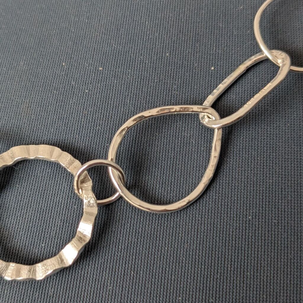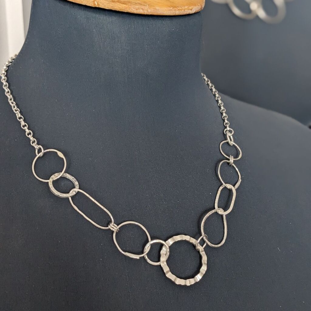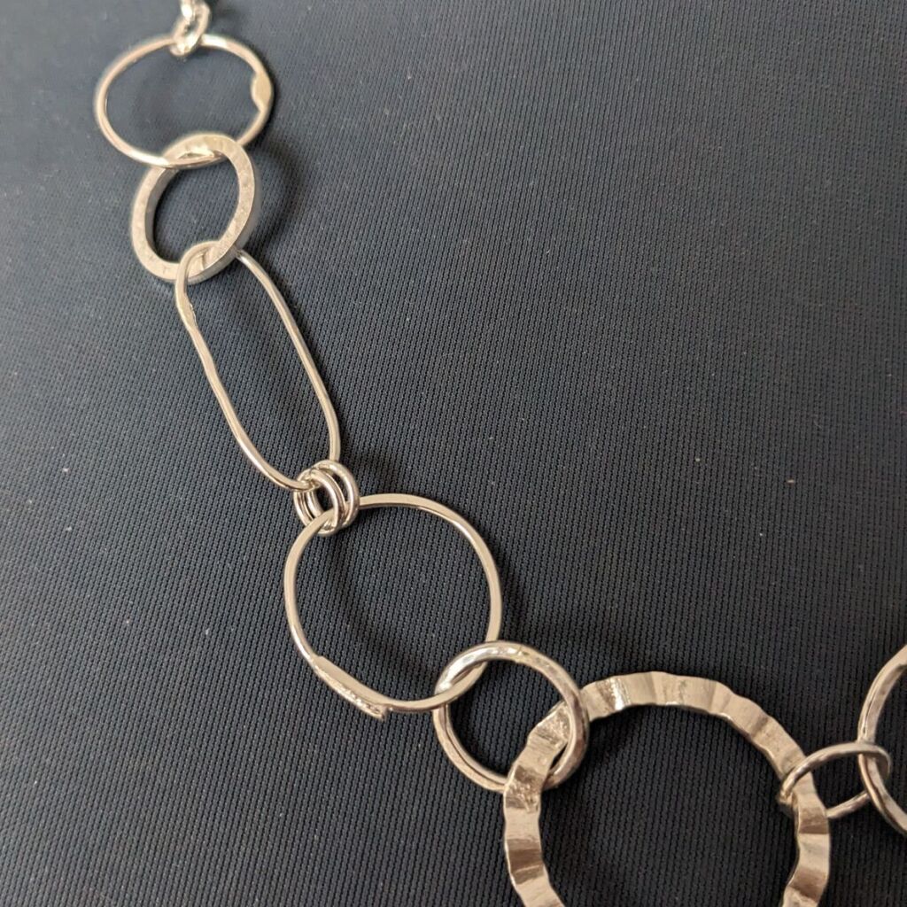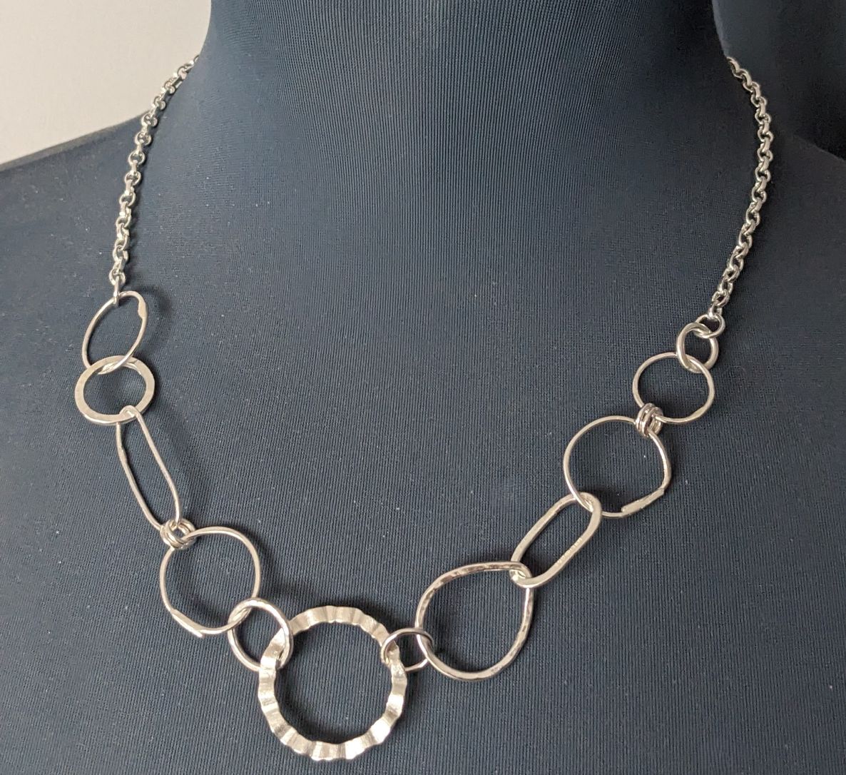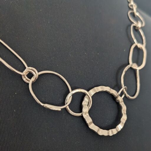 This fabulous chain necklace is a real statement piece, featuring a random selection of mismatched links. Each of the links has been individually hand formed from sterling silver wire in a variety of different shapes and textures. They have been joined together, with added belcher chain and a bolt clasp, to create a totally unique necklace.