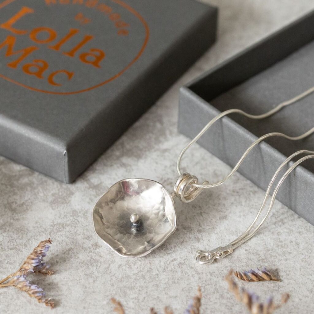 You will receive your sterling silver flower pendant tissue wrapped in a LollaMac branded grey gift box.