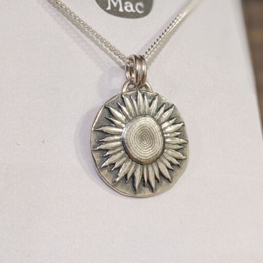 This lovely pendant features a sunflower design which has been impressed into a nugget of recycled sterling silver. The impression has a wonderfully detailed texture which really brings the image to life. The necklace has a nice weighty feel to it (a little over 4g) and hangs beautifully from a sterling silver curb chain.