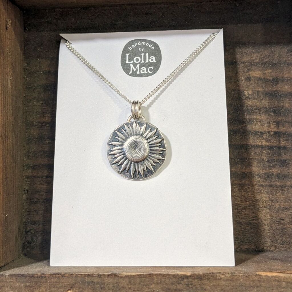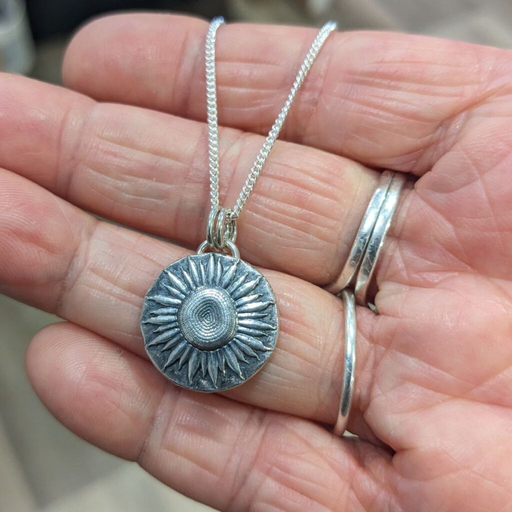 Each sunflower impression is produced individually me in my studio; there’s no mass production going on here! Firstly I melt down an ingot of silver using the offcuts I keep from other projects. Then I press the shape using an impression die and a hydraulic press. This could be repeated 4 or 5 times before I’m totally happy with the depth and detail of the print, annealing the metal between each stage. Once I think I’ve got the perfect print, I file away the excess material and smooth the edges, before soldering on the bale. The impression gets a light oxidising to really make the details pop before a final polish. And voila!
