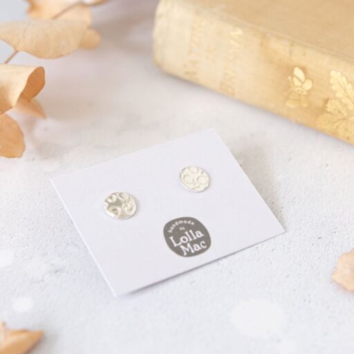 These cute textured silver midi studs are the perfect earrings for dress-down days. Handmade by me, the discs have been punched out of textured sterling silver sheet. They have a soldered sterling silver post and secure butterfly fastening.