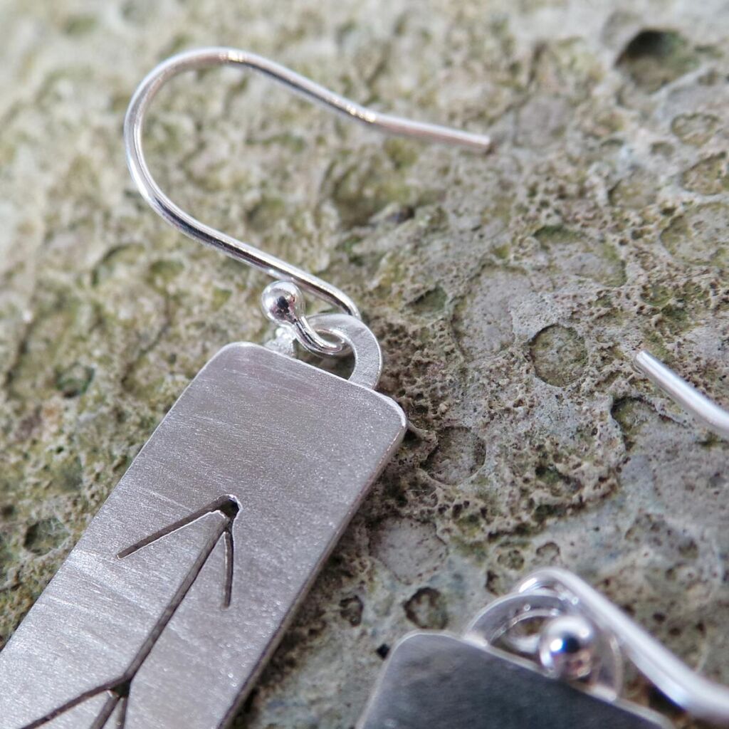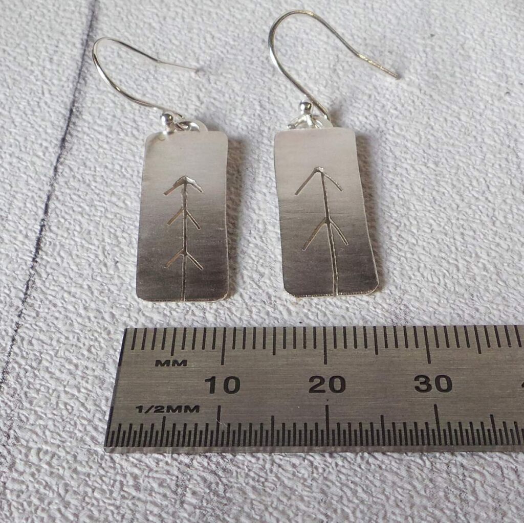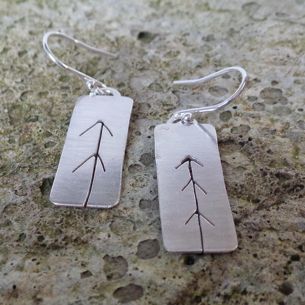 Inspired by Northumbrian landscape, these pretty rectangular drop earrings feature a stylised pine tree which has been pierced (sawn) through sterling silver. Each tree is drawn individually and cut out entirely by hand, meaning every earring is completely unique.
