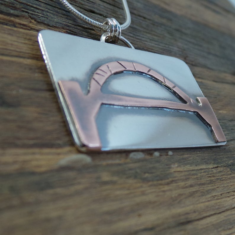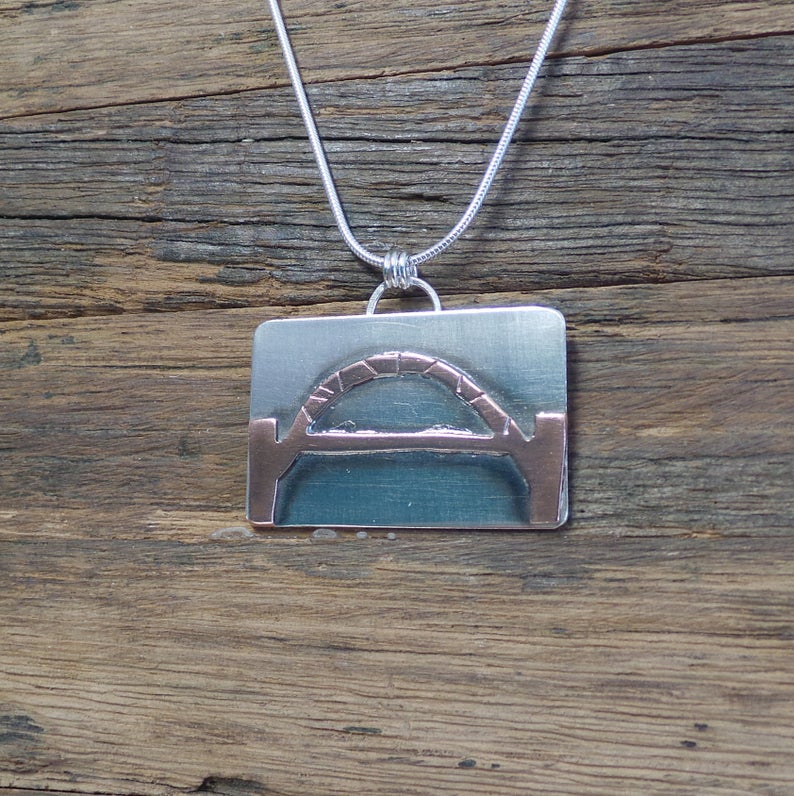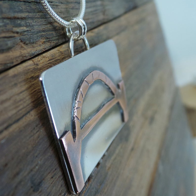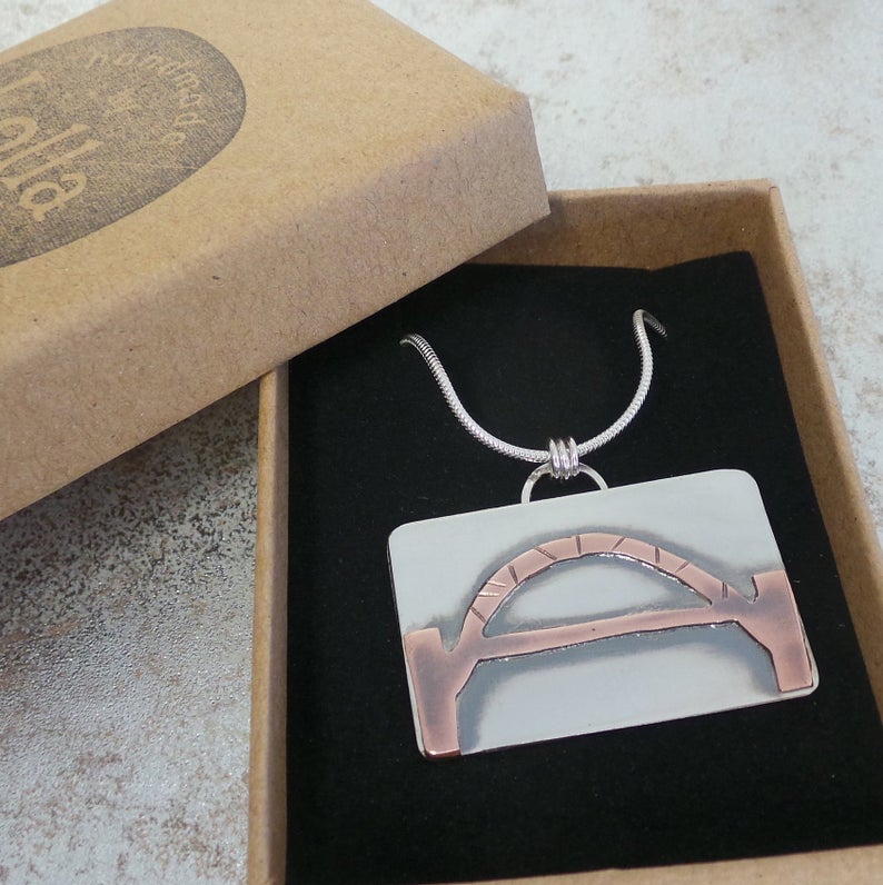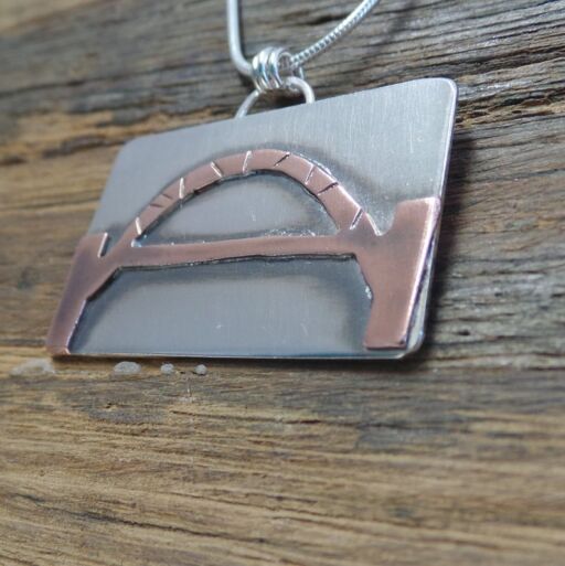This striking Tyne Bridge pendant would make the perfect gift for someone who has a special connection with the North East of England! It has been handmade from sterling silver with a hand-cut  copper overlay which depicts the iconic Tyne Bridge. The pendant has been lightly oxidised to bring out the texture markings on the bridge. It hangs from an 18″ sterling silver snake chain and has a very light brushed finish.